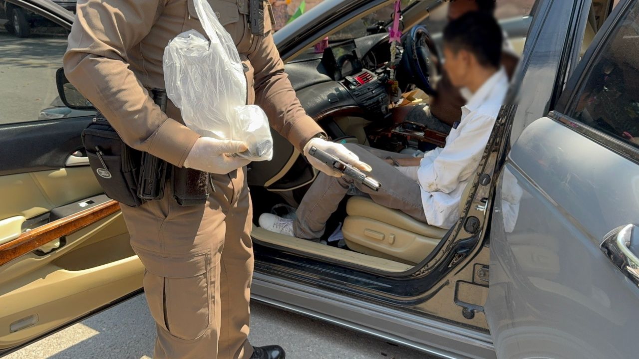 เมื่อถึงที่เกิดเหตุพบคนร้าย 2 คน ถูกเจ้าหน้าที่ควบคุมตัวไว้ได้ นั่งลงกับพื้น เจ้าหน้าที่ตำรวจตรวจสอบภายในรถ พบของกลางเป็นอาวุธปืน 2 กระบอก ขนาด 9 มม. พร้อมเครื่องกระสุนจำนวนหนึ่ง และพบยาบ้าบรรจุในซองประมาณ 200 เม็ด พร้อมอุปกรณ์เสพ จึงตรวจยึดไว้เป็นหลักฐาน พร้อมนำตัวมาชี้ของกลางทั้งหมด ทราบชื่อหนึ่งในคนร้ายคือ นายประทีป หรือพี (สงวนนามสกุล) เป็นคนขับ (คนถอดเสื้อคนอ้วน-ไม่ทราบอายุ)
