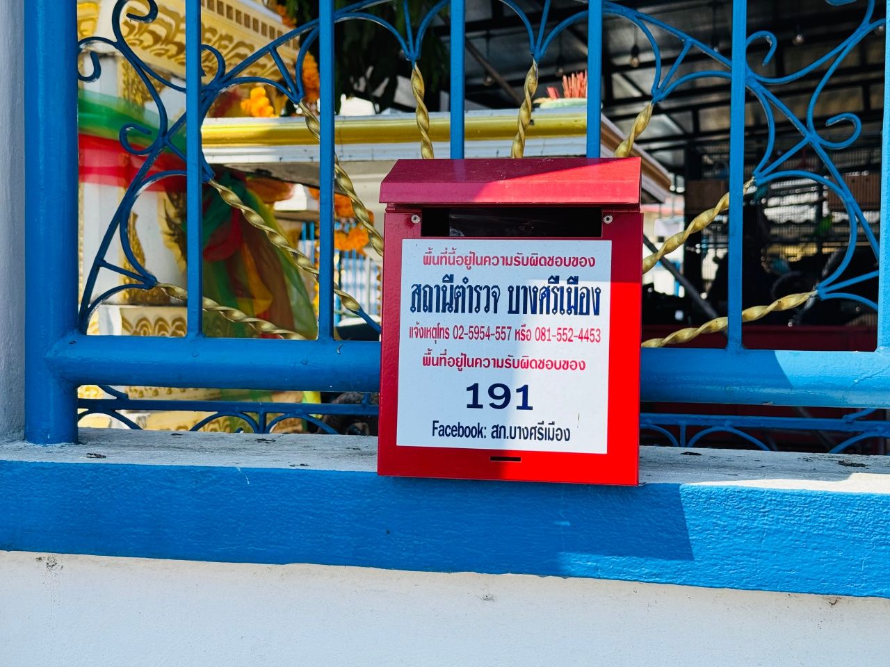 จากการสังเกตพบว่าที่รั้วหน้าบ้านดังกล่าวมีการนำตู้แดงของ สภ.บางศรีเมือง มาติดไว้อีกด้วย.