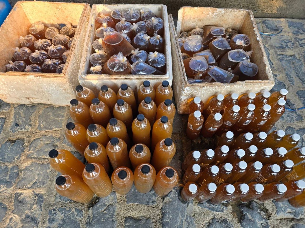 หลังจากเจ้าหน้าที่เข้าแสดงตัวเพื่อตรวจสอบใบอนุญาตจากสำนักงานสาธารณสุขจังหวัด หรือทะเบียน อย. ปรากฏว่าผู้จำหน่ายไม่มีแสดง โดยระบุว่าไม่ได้ขออนุญาต เจ้าหน้าที่จึงเข้าตรวจสอบพบว่าหลังร้านเป็นแหล่งผลิต มีกำลังการผลิตต่อวันกว่า 1 พันแกลลอน และชนิดขวดอีกนับพันขวด ส่วนแกลลอนนั้นจะถูกไปแบ่งใส่ขวดแบบขายปลีกอีกครั้ง กระจายส่งขายไปยังจุดขายต่างๆแบบขายส่ง และขายหน้าร้าน สามารถสร้างกำไรต่อวันสูงถึงกว่า 1 หมื่นบาทต่อวัน หรือต่อเดือนมีกำไรมากกว่า 3 แสนบาท ต้องใช้รถยนต์กระบะของเจ้าหน้าที่หลายคัน จึงสามารถขนของกลางที่ได้ตรวจยึดทั้งหมด