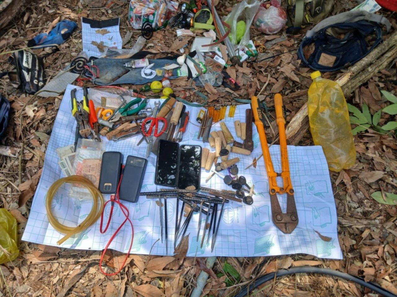 จากการตรวจค้นพื้นที่บริเวณดังกล่าว พบรถจักรยานยนต์จำนวน 2 คัน อุปกรณ์งัดรถ กุญแจตัวที กุญแจรถจักรยานยนต์จำนวนมาก พร้อมอุปกรณ์ที่ดัดแปลงมาเตรียมอุดปลายท่อรถจักรยานยนต์เพื่อเก็บเสียง คีมตัดเหล็ก ยาเบื่อสุนัข ธูปรมควันให้คนและสุนัขหลับสนิท จึงควบคุมตัวทั้งคู่ไปส่ง รพ.โป่งน้ำร้อน เพื่อทำบาดแผลแล้วนำดำเนินคดีตามกฎหมาย ส่วนรถของกลางที่มีเจ้าทุกข์แจ้งความไว้แล้วทั้งสองคัน จะได้ติดต่อให้เจ้าของนำเอกสารมายืนยันรับรถต่อไป