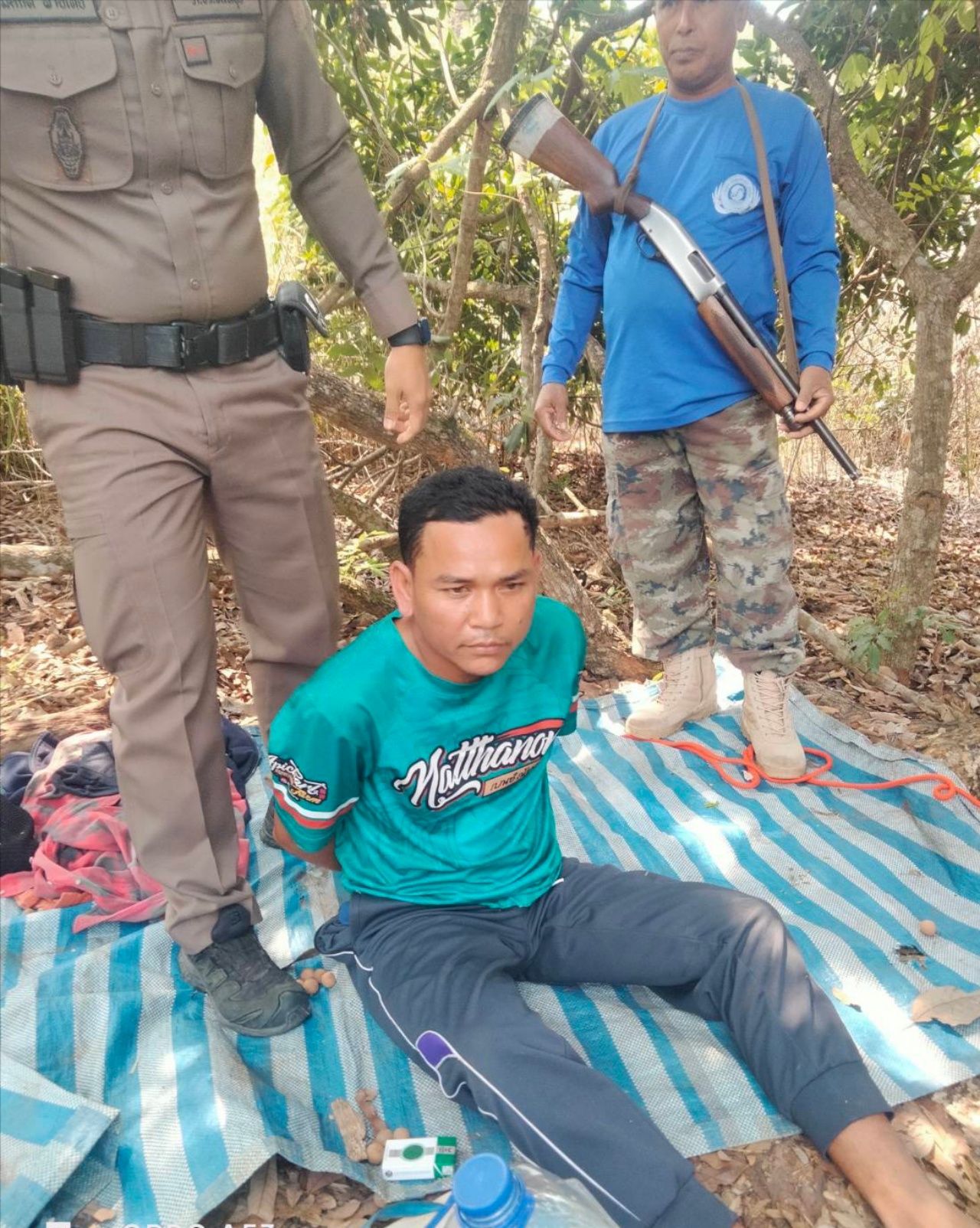 ทันทีที่เห็นเจ้าหน้าที่ คนร้ายพยายามจะหลบหนี เจ้าหน้าที่ ชรบ. จึงยิงสกัดไป 1 นัด กระสุนเข้าที่ข้อเท้าขวาของคนร้ายจนล้มกลิ้ง อีกคนเมื่อเห็นเพื่อนล้ม ก็หยุดวิ่งและยอมหมอบลงกับพื้นให้เจ้าหน้าที่จับกุม ทราบชื่อคนเจ็บต่อมาคือ นายเมด ไม่ทราบนามสกุล อายุ 34 ปี ส่วนเพื่อนคือ นายแซท เรียม อายุ 35 ปี ทั้งคู่เป็นชาวกัมพูชา