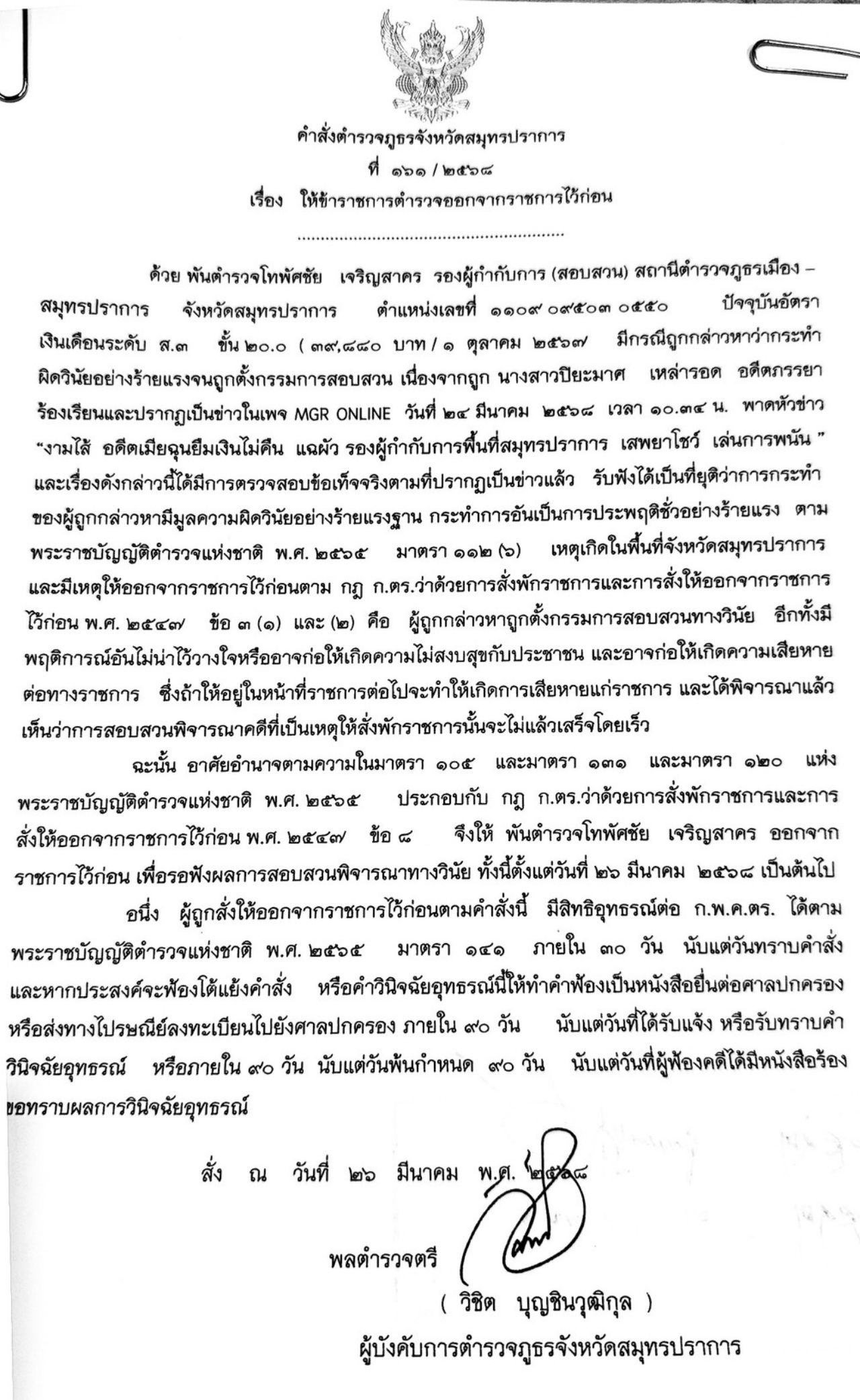 ผบก.ภ.จว.สมุทรปราการ เซ็นหนังสือคำสั่งฟัน รองผกก. (สอบสวน) สภ.พระประแดง ให้ออกจากราชการไว้ก่อน ชี้ผิดวินัยร้ายแรง ประพฤติชั่ว เซ่นคลิปนั่งเสพยาไอซ์