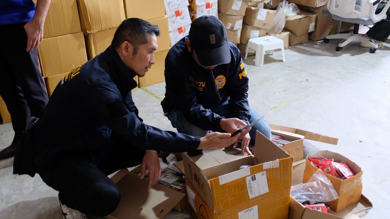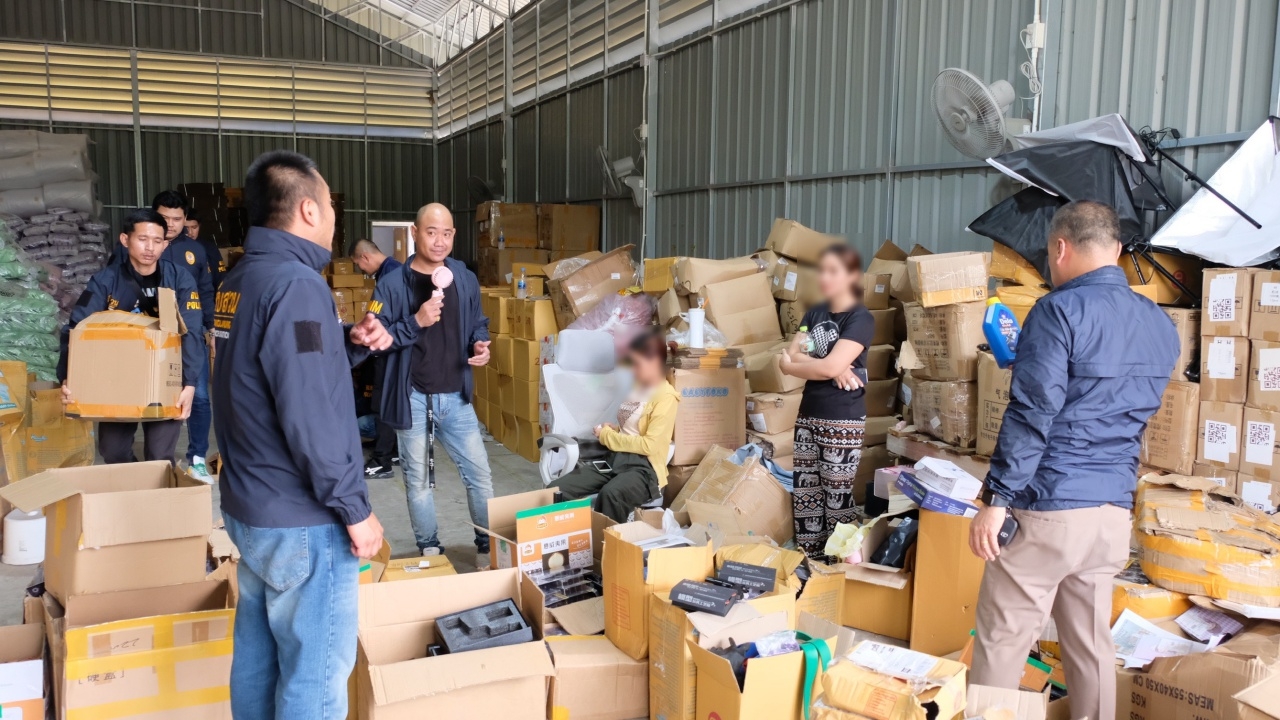 ในการตรวจสอบเบื้องต้น โกดังสินค้าดังกล่าวมีเนื้อที่ประมาณ 1 งาน สินค้าที่กักเก็บอยู่ในโกดังมีหลากหลายรูปแบบ ทั้งผลิตภัณฑ์อาหารเสริม เครื่องสำอาง ยารักษาโรค สินค้าที่ใช้สำหรับสัตว์เลี้ยง สินค้าของตกแต่งบ้าน สินค้าอิเล็กทรอนิกส์ และสิ่งเทียมอาวุธ มีทั้ง อาวุธปืนปลอม สนับมือ กระบองโซ่บรูซลี จำนวนมาก โดยสินค้าส่วนใหญ่ถูกนำเข้ามาจากประเทศจีน ถูกวางกองพะเนินเต็มโกดัง นอกจากนี้ยังพบชายชาวจีน 1 คน ชายไทย 1 คน และผู้หญิงไทย 2 คน กำลังแพ็คสินค้าใส่กล่องพัสดุ เตรียมส่งให้กับลูกค้า เจ้าหน้าที่จึงได้สั่งให้ยุติการทำงาน พร้อมทั้งให้นำเอกสารการนำเข้าสินค้าดังกล่าวมาแสดง แต่ปรากฏว่าคนที่อยู่ภายในโกดังไม่สามารถนำเอกสารมาแสดงที่มาของสินค้าดังกล่าวได้ เบื้องต้นจึงทำการตรวจยึดสินค้าทั้งหมดไว้ทำการตรวจสอบ