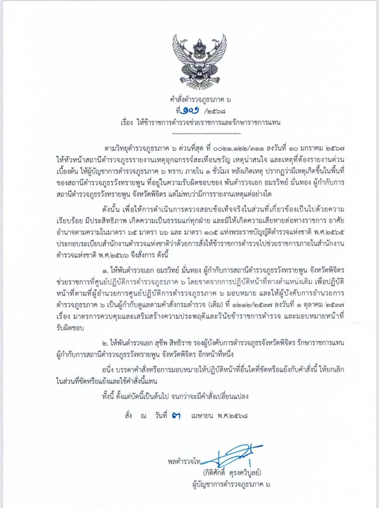 เมื่อเวลา 09.00 น. วันที่ 5 เมษายน 2568 ที่ จ.พิจิตร ผู้สื่อข่าวรายงานว่า พล.ต.ต.ฐเดช กล่อมเกลี้ยง ผบก.ภ.จว.พิจิตร เปิดเผยผ่านทางโทรศัพท์กับผู้สื่อข่าวว่า พล.ต.ท.กิติศักดิ์ ดุรงควิบูลย์ ผบช.ภ.6 ได้ลงนามในคำสั่งตำรวจภูธรภาค 6 ที่ 101/2568 เรื่องให้ข้าราชการตำรวจช่วยราชการและรักษาราชการแทน 1. ให้ พ.ต.อ.อมรวิทย์ มั่นทอง ผกก.สภ.วังทรายพูน จ.พิจิตร ช่วยราชการที่ศูนย์ปฏิบัติการตำรวจภูธรภาค 6 โดยขาดจากการปฏิบัติหน้าที่ทางตำแหน่งเดิม และ 2. ให้ พ.ต.อ.ชูชีพ สิทธิราช รองผบก.ภ.จว.พิจิตร รักษาราชการแทน ผกก.สภ.วังทรายพูน จ.พิจิตร อีกหน้าที่หนึ่ง ทั้งนี้ตั้งแต่บัดนี้เป็นต้นไป