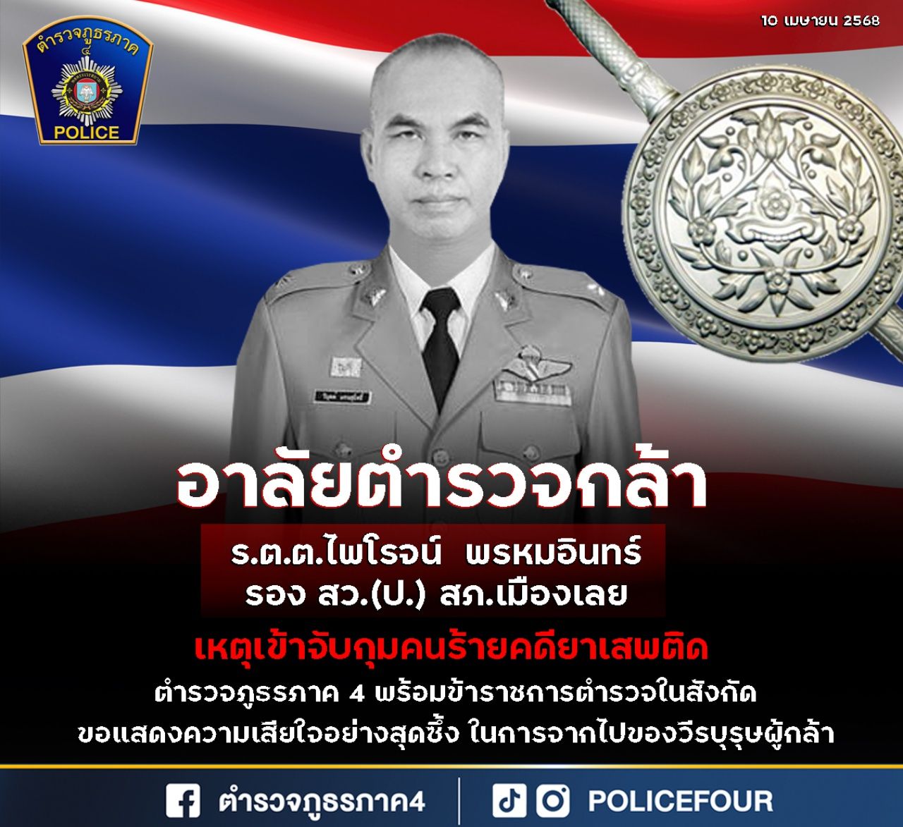 วันที่ 10 เม.ย. 68 พล.ต.ท.อาชยน ไกรทอง โฆษกสำนักงานตำรวจแห่งชาติ เปิดเผยว่า พล.ต.อ.กิตติ์รัฐ พันธุ์เพ็ชร์ ผบ.ตร. แสดงความเสียใจและอาลัยต่อการสูญเสียตำรวจกล้า "ร.ต.ต.ไพโรจน์ พรหมอินทร์ รอง สว.(ป.) สภ.เมืองเลย" (อ่านข่าว : ล่าตัวคนร้ายหลบหนี หลังยิงตำรวจดับคาสวนยาง ขณะเข้าตรวจจับยาบ้า)