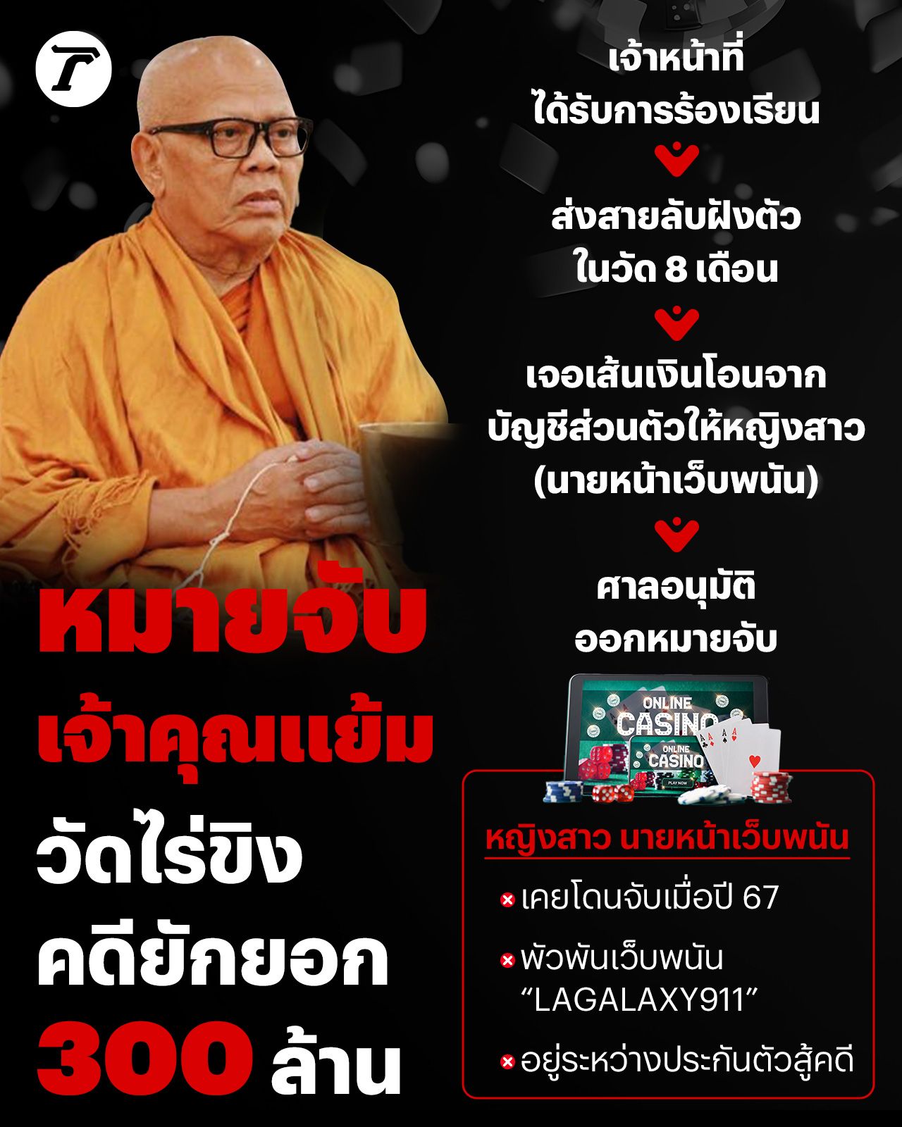 เส้นทางออกหมายจับ "เจ้าคุณแย้มวัดไร่ขิง" เจ้าอาวาสคนดัง หลังพบมีการร้องเรียนยักยอกเงิน 300 ล้าน ตร.แฝงตัวสืบ 8 เดือน พบหญิงสาวเครือข่ายเว็บพนัน ทำหน้าที่รับเงินโอนส่งต่อ