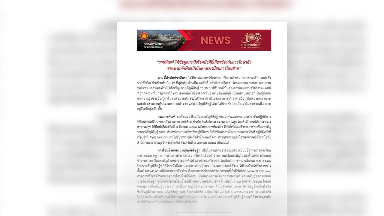 เมื่อวันที่ 17 มิถุนายน 2568 กรมราชทัณฑ์ แจกเอกสารชี้แจงตามที่สำนักข่าวอิศรา ได้มีการเผยแพร่ข้อความ “วิจารณ์ ขรม! พยาบาลเรียกรถส่งตัวนายทักษิณ ย้ายข้ามห้วยไป รพ.ที่สุโขทัย บ้านเกิด “สมศักดิ์” #สำนักข่าวอิศรา”