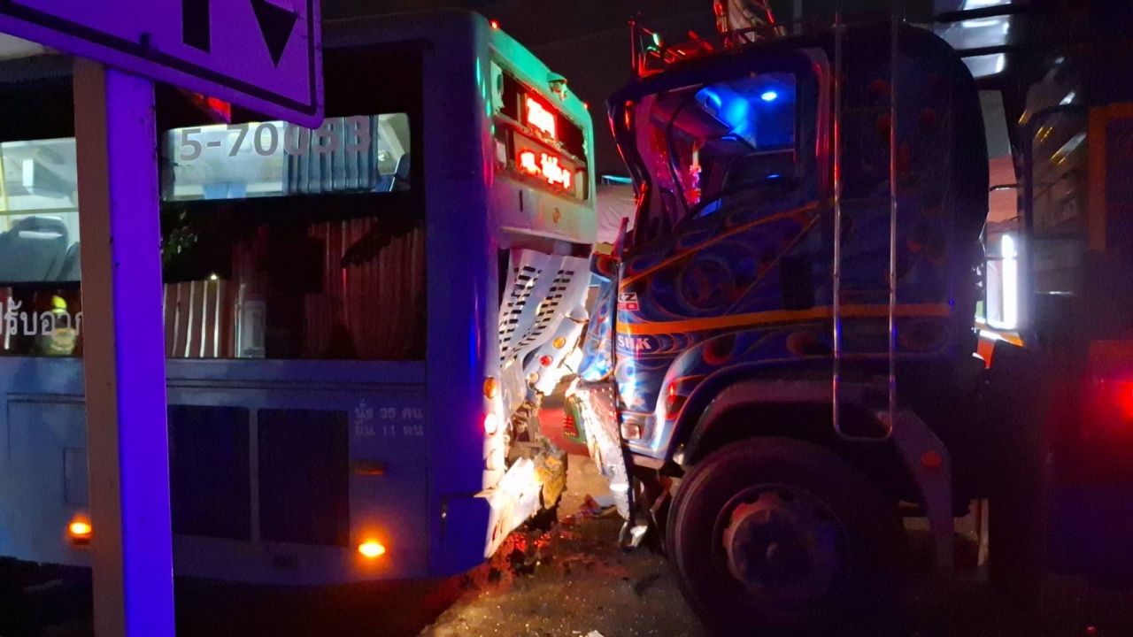 จากการตรวจสอบที่เกิดเหตุ ทิศทางมุ่งหน้าสามแยกพระประแดง พบรถบรรทุกพ่วง 22 ล้อบรรทุกทรายมาเต็มลำ ยี่ห้ออีซูซุ สีน้ำเงิน หัวพ่วง ทะเบียน 53-5845 กรุงเทพมหานคร ส่วนท้ายพ่วงทะเบียน 53-5846 กรุงเทพมหานคร อยู่ในสภาพชนเข้ากับท้ายรถประจำทางปรับอากาศ สาย 21 E สีน้ำเงิน หมายเลขข้างรถ 5-70053 ทะเบียน 16-1360 กรุงเทพมหานคร จนรถประจำทางคันดังกล่าวได้พุ่งไปชนกับรถยนต์นั่งส่วนบุคคล สีน้ำเงิน ทะเบียน ฐธ 1362 กรุงเทพมหานคร จนรถยนต์นั่งส่วนบุคคลชนติดคาอยู่กับต้นไม้ข้างทาง ทำเสาของป้ายบอกทางถึงกับหักโค่นไปทับรถจักรยานยนต์ ยี่ห้อยามาฮ่า รุ่น แกรนฟีราโน่ สีดำ ทะเบียน 7 ขห 8450 กรุงเทพมหานคร ได้รับความเสียหายทั้งคัน