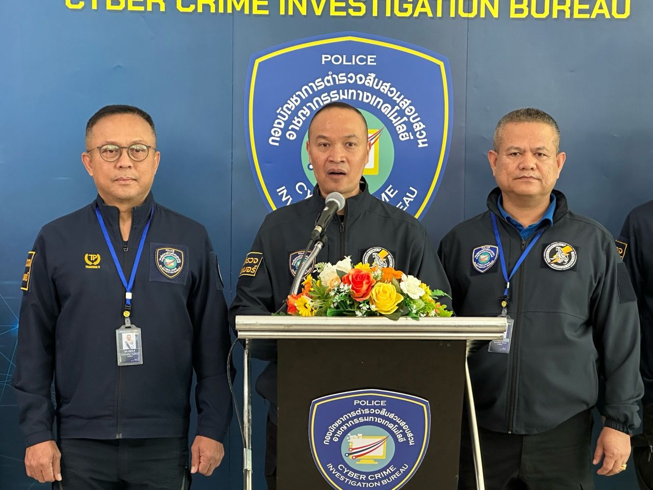 เมื่อเวลา 13.00 น. วันที่ 23 ก.ค. ที่กองบัญชาการตำรวจสืบสวนสอบสวนอาชญากรรมทางเทคโนโลยี (บช.สอท.) เมืองทองธานี อ.ปากเกร็ด จ.นนทบุรี พล.ต.ท.ไตรรงค์ ผิวพรรณ ผบช.สอท. พล.ต.ต.ทินกร รังมาตย์ รอง ผบช.สอท. พล.ต.ต.ศิริวัฒน์ ดีพอ ผบก.สอท.1 พล.ต.ต.กฤตัสญ์ บำรุงรัตนยศ ผบก.สอท.4 พ.ต.อ.ปรีดา คงจัด รอง ผบก.สอท.1 พ.ต.อ.วีร์กวิน เสริมศรีธนชัย ผกก.3 บก.สอท.1 ร่วมกันแถลงผลปฏิบัติการรวบสาย 2 แก๊งคอลเซ็นเตอร์ ปอยเปต โทรหลอกเป็นตำรวจมุกดาหาร