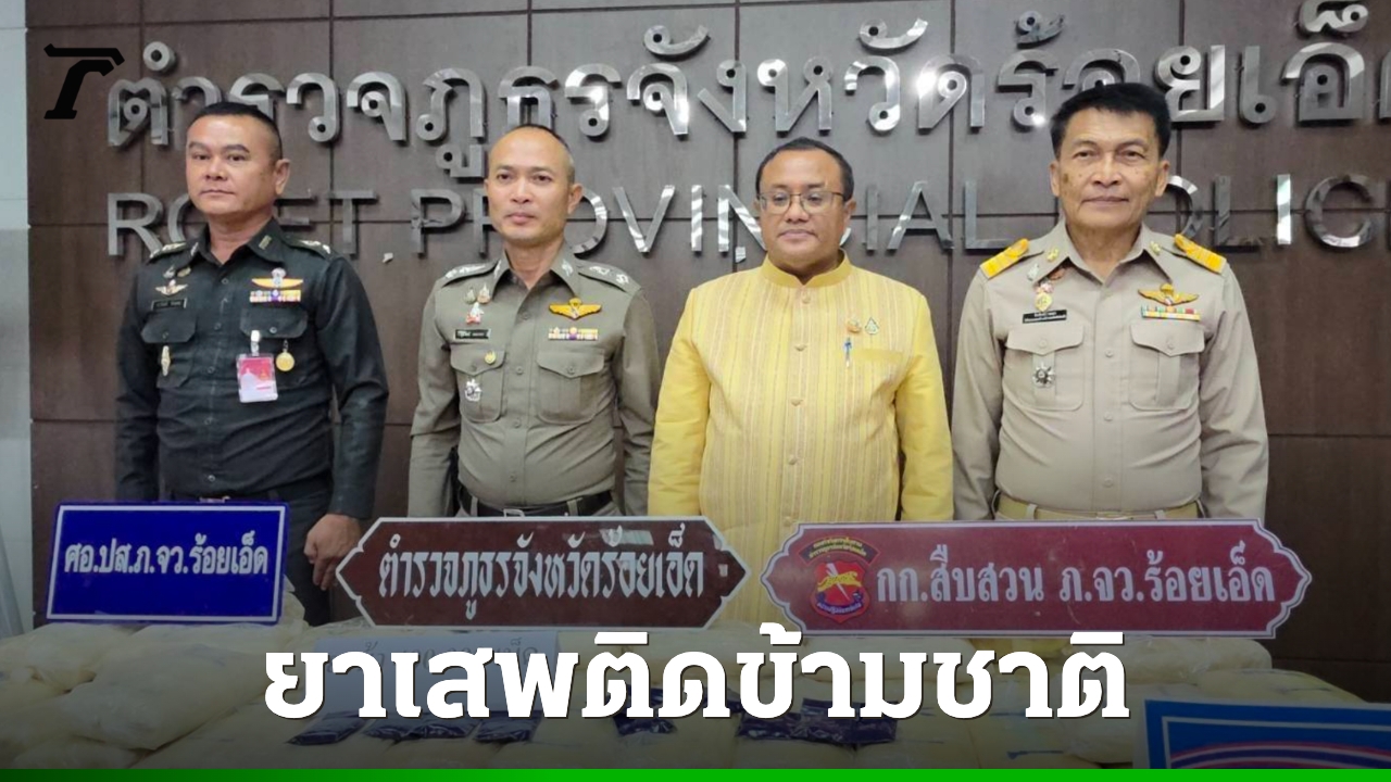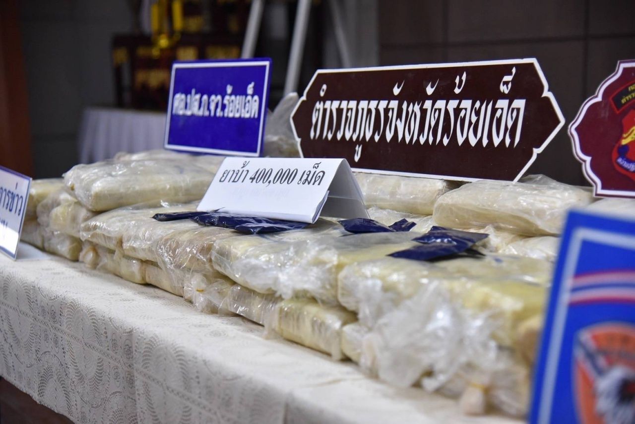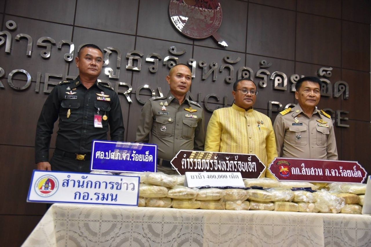 เจ้าหน้าที่ร่วมกันแถลงข่าวจับกุมเครือข่ายยาเสพติดรายสำคัญ ยาบ้าล็อตใหญ่ 4 แสนเม็ด ข้ามชายแดนลาวสู่พนมไพร จ.ร้อยเอ็ด