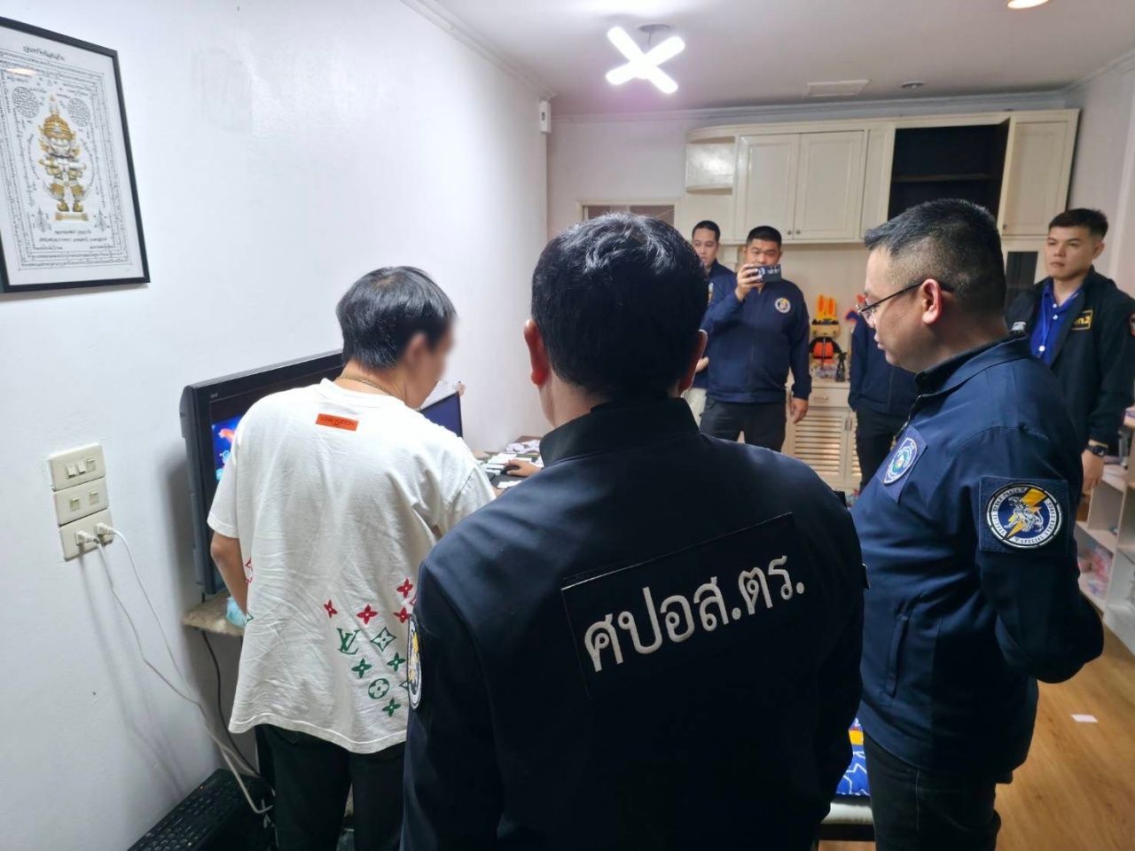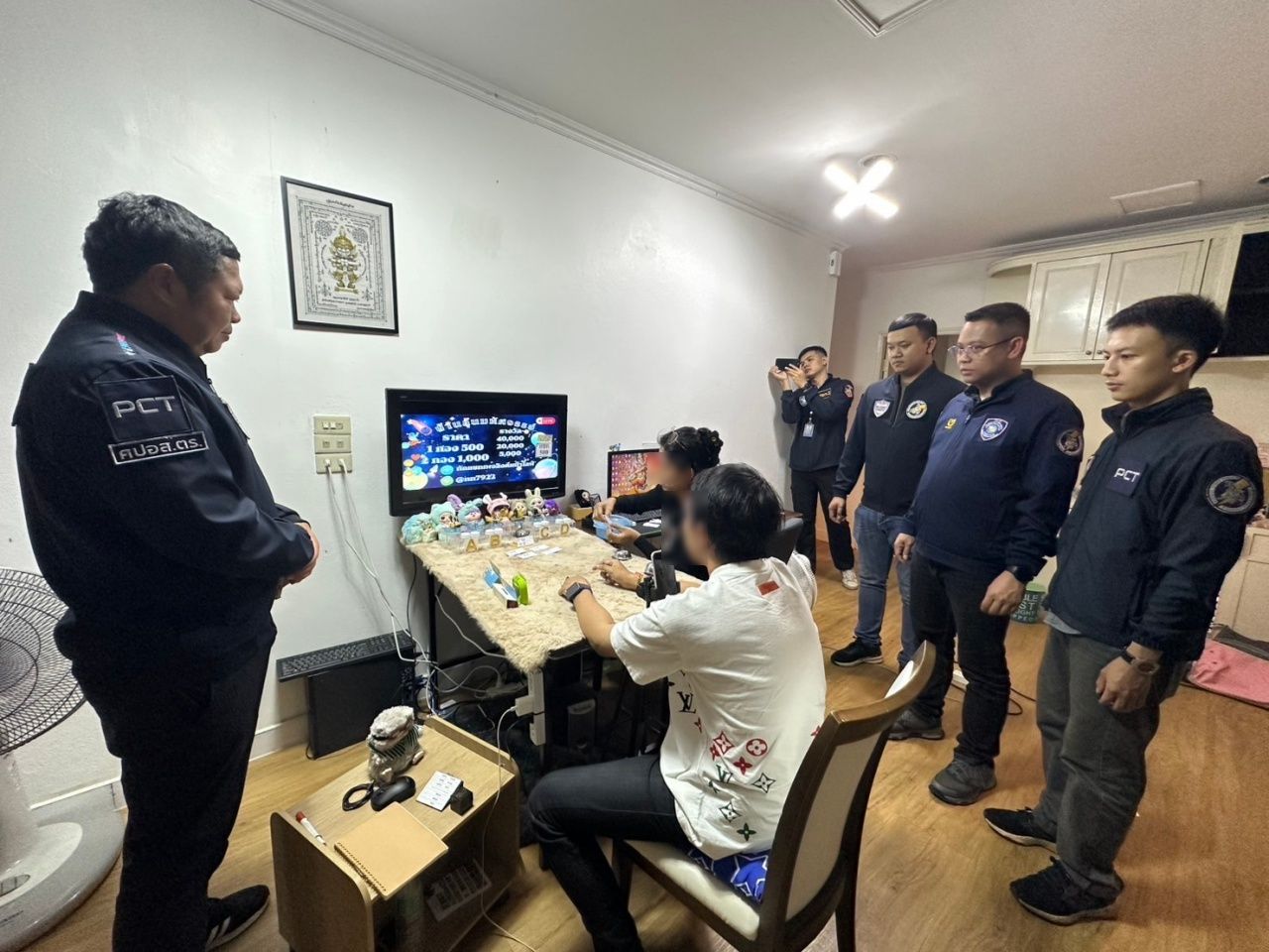 นำกำลังตำรวจไซเบอร์และตำรวจชุดปฏิบัติการสืบสวนตรวจวิเคราะห์ฯ (ศปอส.ตร.) พร้อมหมายค้นศาลอาญา ที่ 738/2568 ค้นบ้านหลังหนึ่งในซอยแจ้งวัฒนะ 14 แขวงทุ่งสองห้อง เขตหลักสี่ กรุงเทพฯ เข้าจับกุมนายวิทวัฒน์ นาคสุข อายุ 35 ปี ชาว จ.นนทบุรี ผู้ต้องหาตามหมายจับศาลอาญา ที่ 5247/2568 พร้อมตรวจยึดของกลาง คอมพิวเตอร์ 2 เครื่อง เราเตอร์พร้อมอุปกรณ์ 1 ชุด และตลับพลาสติกใส่กระดาษบอกยอดรางวัลจำนวนหนึ่ง