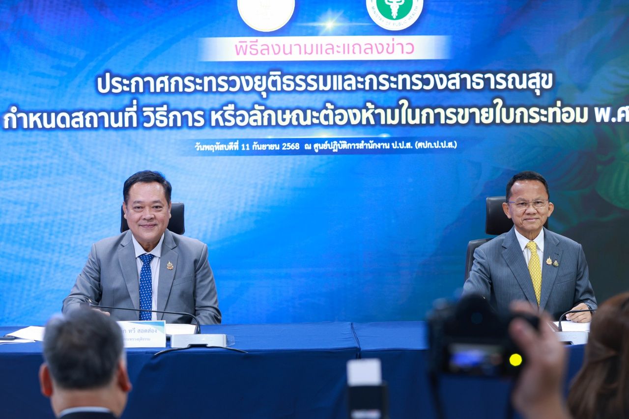 เมื่อเวลา 11.00 น. วันที่ 11 กันยายน 2568 ที่สำนักงาน ป.ป.ส. (ดินแดง) พ.ต.อ.ทวี สอดส่อง รมว.ยุติธรรม และนายสมศักดิ์ เทพสุทิน รมว.สาธารณสุข ได้ร่วมลงนามในประกาศกระทรวงยุติธรรมและกระทรวงสาธารณสุข เรื่อง กำหนดสถานที่ วิธีการ หรือลักษณะต้องห้ามในการขายใบกระท่อม พ.ศ. 2568