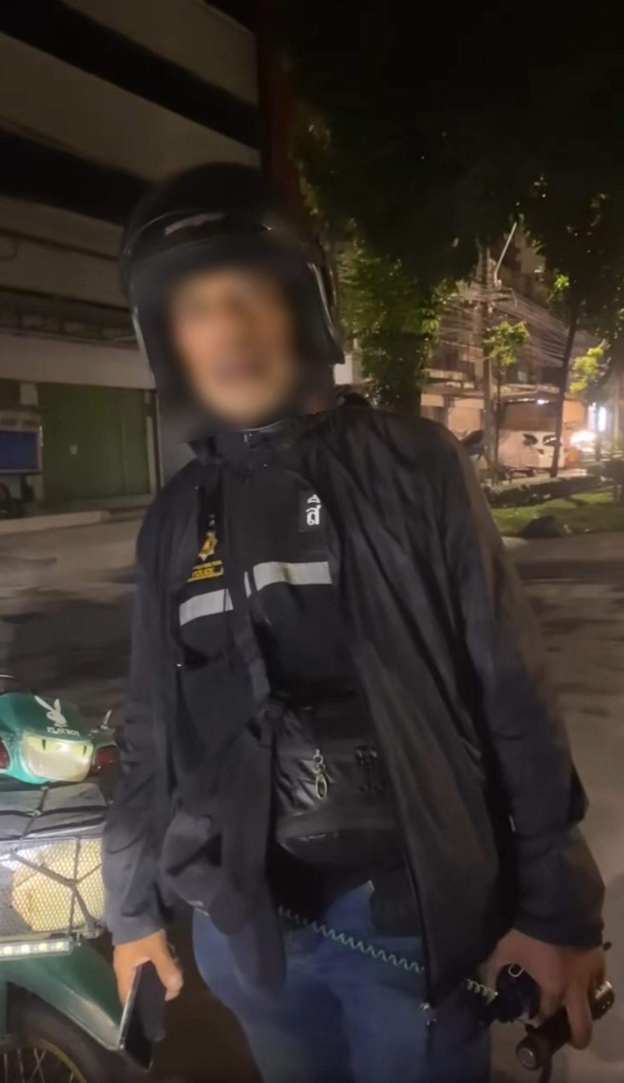 เมื่อมาถึงก็อ้างว่าเป็นตำรวจสืบสวน และใช้ไฟฉายพยายามจะตรวจค้น พร้อมกับด่าทอตนว่า "เป็นไรเดอร์ทำไมไม่มีกล่องอาหารข้างท้ายรถ" พร้อมด่าทอด้วยถ้อยคำหยาบคายตามที่ปรากฏในคลิป ซึ่งตนเองจะพยายามอธิบายอย่างไร ผู้ก่อเหตุก็ไม่ยอมฟัง พร้อมกับข่มขู่ว่า จะวิทยุเรียกตำรวจสายตรวจมาจับกุมและจะลงมือตบหน้าตน
