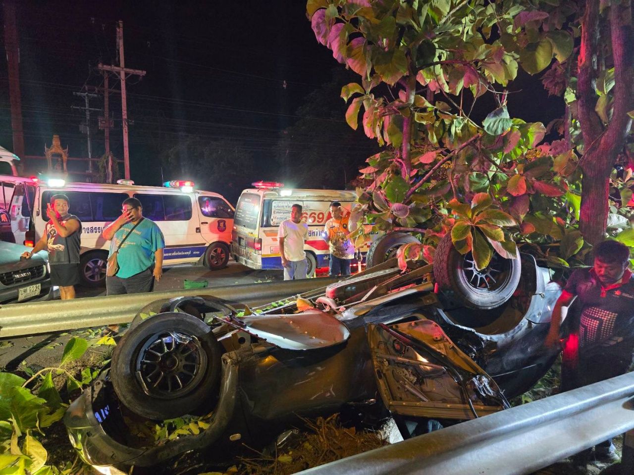 ที่เกิดเหตุพบรถมิตซูบิชิ ปาเจโร่ สีดำ หมายเลขทะเบียนกำแพงเพชร ชนกับต้นไม้พลิกคว่ำอยู่ร่องกลางถนน โดยเจ้าหน้าที่หน่วยกู้ภัยมูลนิธิสว่างสรรเพชญธรรมสถาน จ.เพชรบุรี นำอุปกรณ์เครื่องตัด-ถ่าง เข้าดำเนินการช่วยเหลือ งัดร่างผู้ได้รับบาดเจ็บออกมาจากตัวรถ ก่อนนำส่งรักษาต่อยังโรงพยาบาลเขาย้อย จ.เพชรบุรี ทราบชื่อต่อมาคือ นายศักดิ์ดา อายุ 34 ปี