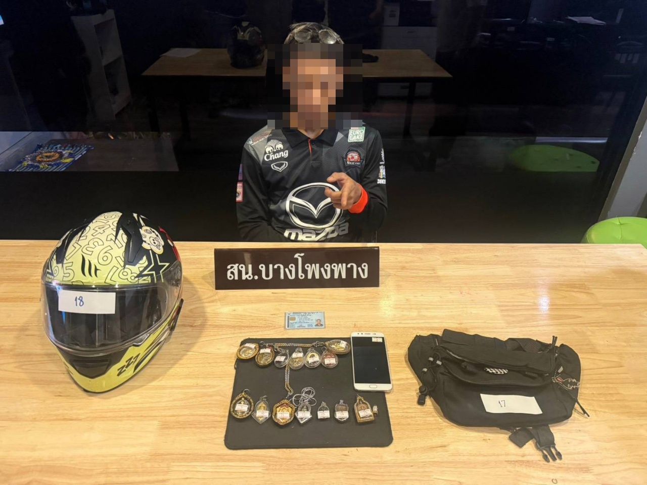 พร้อมของกลางพระเครื่อง หลวงพ่อพัฒน์ 1 เหรียญ หลวงพ่อพัฒน์ ปล้องอ้อย 1 เหรียญ พ่อดำด้านหลังหลวงพ่อจ่าดำถือปืน 1 เหรียญ หลวงปู่เขียวหน้าหนวด 1 เหรียญ หลวงพ่อชุบวัดวังกระแจะ 1 เหรียญหลวงพ่อบุญให้ 1 เหรียญ หลวงปู่ทวดหลังหน้าฮวงจุ้ย 1 เหรียญ หลวงพ่อทอง 1 เหรียญ ท้าวเวสสุวรรณเนื้อเงินหลวงพ่อพัฒน์ 1 เหรียญ หลวงปู่แสน 1 เหรียญ ท้าวเวสสุวรรณ 1 เหรียญ หลวงปู่เขียว 1 เหรียญ เสมาหลวงพ่อทบชนแตน 1 เหรียญ หลวงปู่ไป๋ 1 เหรียญ เสือวัดปริวาส 1 เหรียญ โทรศัพท์มือถือ 1 เครื่อง ราคา 19,900 บาท