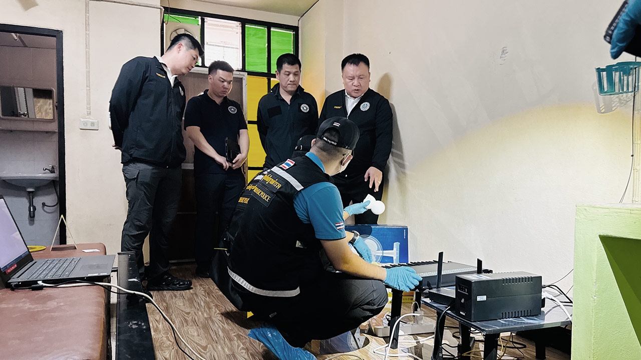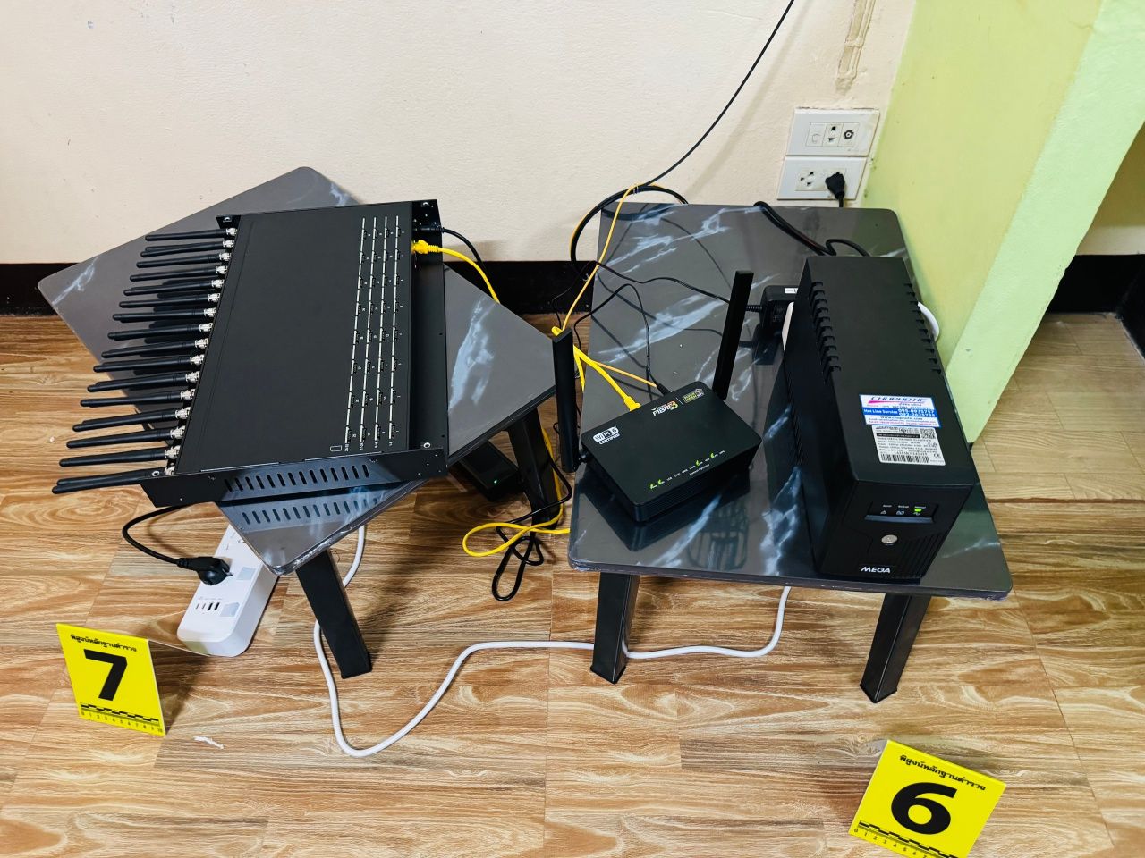 จากการตรวจค้นภายในห้องพักพบเครื่องแปลงสัญญาณโทรศัพท์แบบใส่ซิมการ์ด (ซิมบ็อกซ์ ) จำนวน 1 เครื่อง สามารถใส่ซิมการ์ดได้ 32 ช่อง