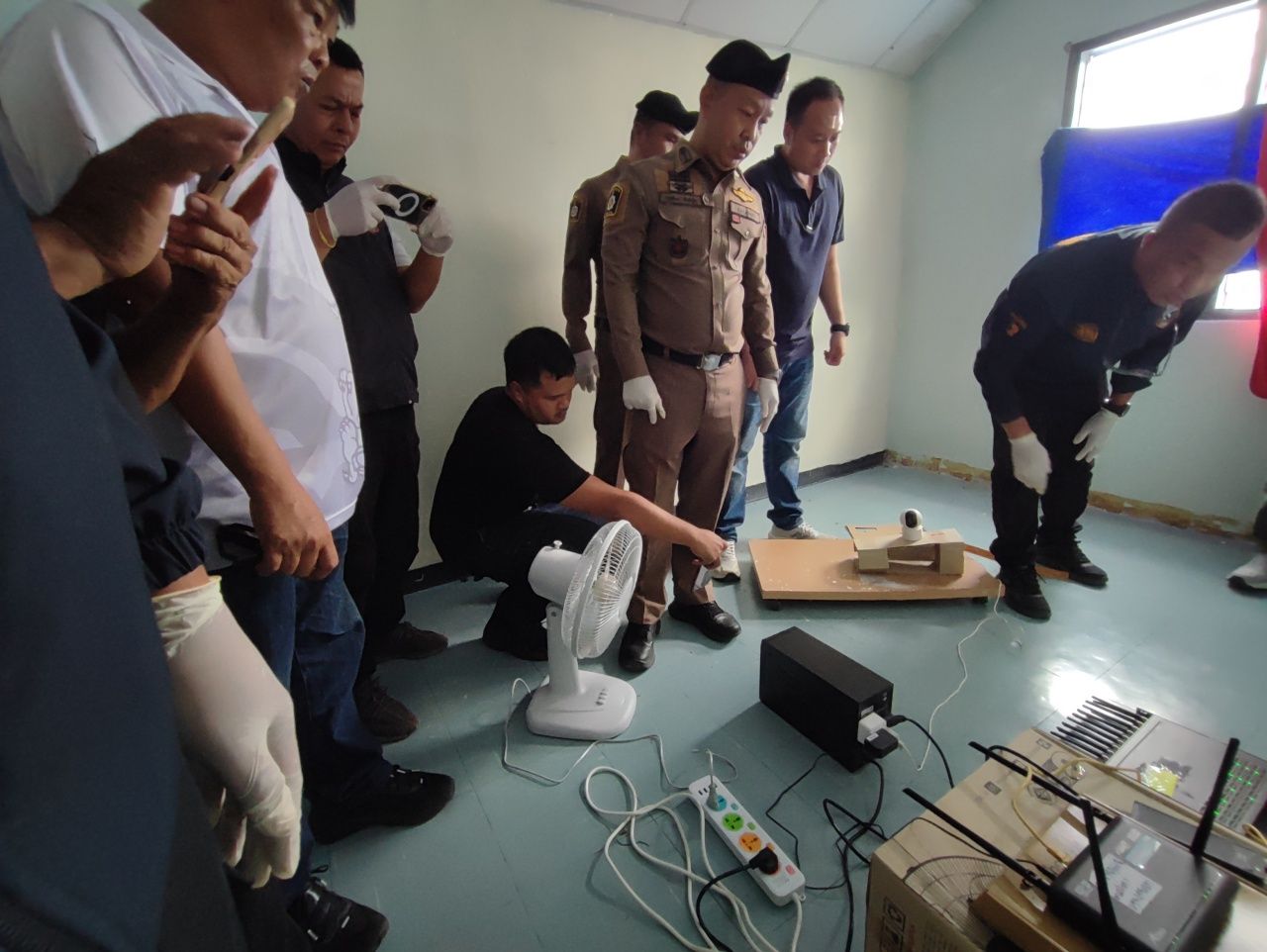 ซึ่งในการตรวจค้นของ เจ้าหน้าที่ได้พบของกลางสำคัญ ได้แก่ เครื่องส่งสัญญาณโทรศัพท์ (Sim Box) ซึ่งสามารถบรรจุซิมการ์ดได้ 128 ช่องต่อเครื่องจำนวน 1 เครื่อง พร้อมอุปกรณ์เชื่อมต่ออินเทอร์เน็ต กล้องวงจรปิด และอุปกรณ์ประกอบอื่น ๆ เป็นเครือข่ายแก๊งคอลเซ็นเตอร์ โดยมีการติดตั้งกล้องวงจรปิดเพื่อสังเกตสถานะการทำงานของเครื่อง หากเครื่องขัดข้องจะมีผู้มาดำเนินการซ่อมแซมหรือเปลี่ยนเครื่องให้กลับมาทำงานได้ตามปกติ