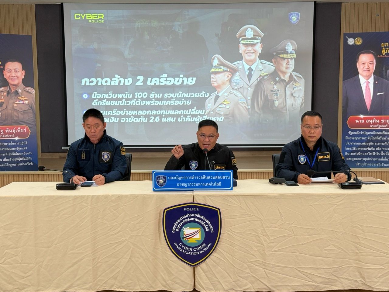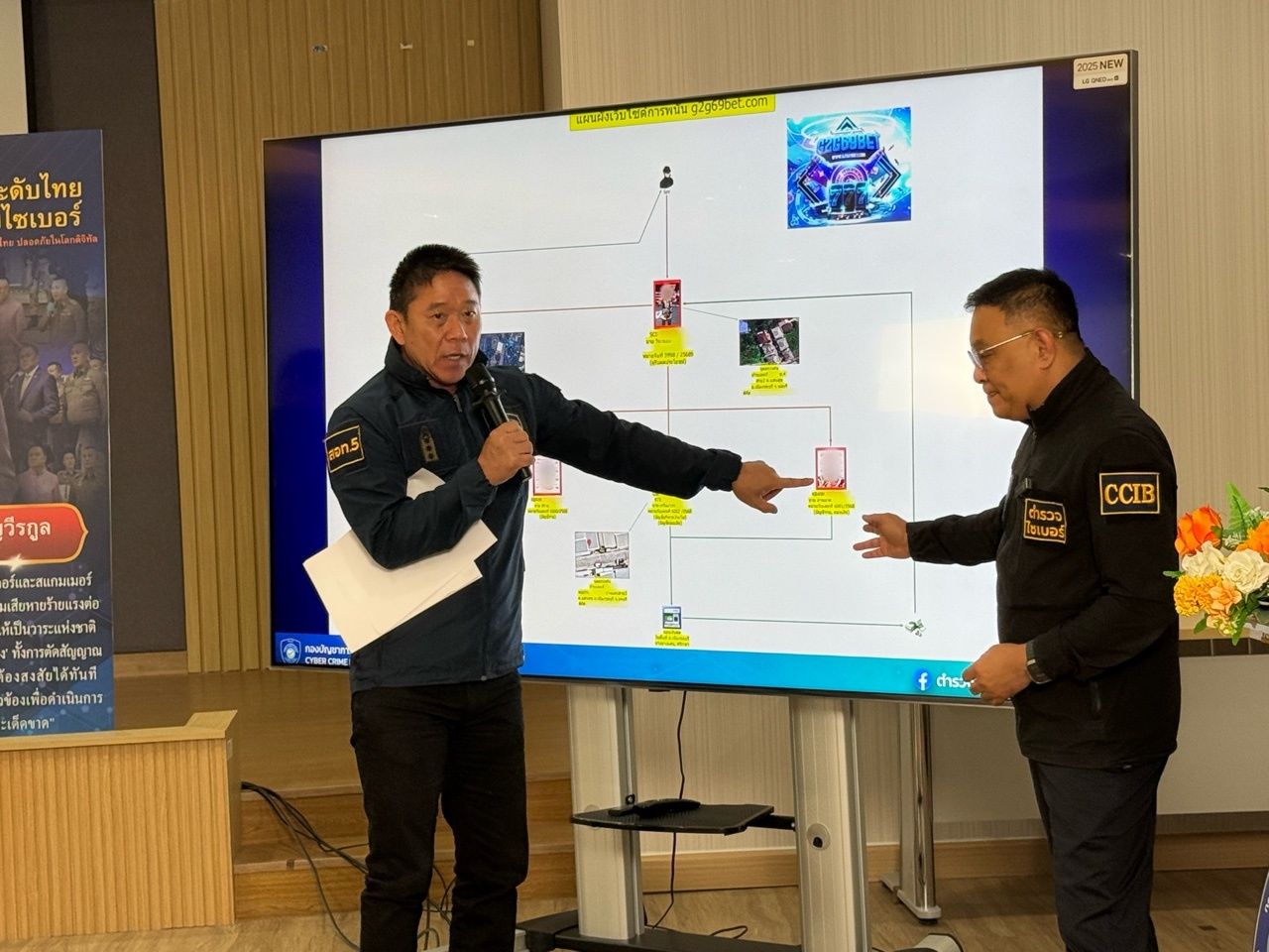 เมื่อเวลา 11.00 น.วันที่ 28 ตุลาคม 2568 ที่กองบัญชาการตำรวจสืบสวนสอบสวนอาชญากรรมทางเทคโนโลยี (บช.สอท.) เมืองทองธานี อ.ปากเกร็ด จ.นนทบุรี พล.ต.ท.สุรพล เปรมบุตร ผบช.สอท. พล.ต.ต.วิวัฒน์ คำชำนาญ รอง ผบช.สอท. พล.ต.ต.ทินกร รังมาตย์ รอง ผบช.สอท. บก.สอท.2 พล.ต.ต.ชัชปัณฑกาณฑ์ คล้ายคลึง รอง ผบช.สอท. พล.ต.ต.ศิลา กาญจน์รักษ์ ผบก.สอท.5 พ.ต.อ.รชตโชค ลีวาณิชคุณ รอง ผบก.สอท.5 พ.ต.อ.อุกฤช ศรีนิติวรวงศ์ ผกก.วิเคราะห์ข่าวและเครื่องมือพิเศษ บก.สอท.5 ร่วมกันแถลงผลปฏิบัติการทลายเครือข่าย “G2G69BET” เว็บพนันรายใหญ่ จับนักมวยไทยชื่อดัง ดีกรีแชมป์หลายเวที มียอดเงินหมุนเวียนกว่า 100 ล้านต่อปี