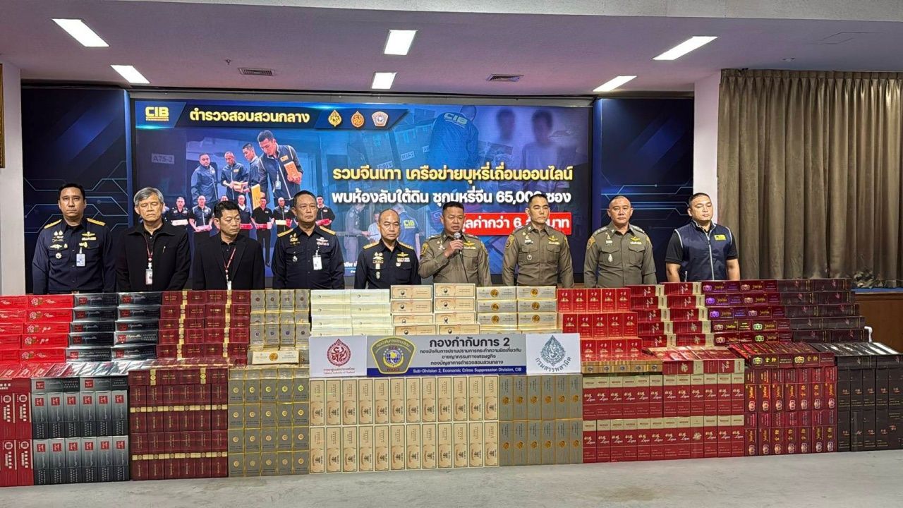 ปอศ. แถลงบุกจับ "จีนเทา" เครือข่ายบุหรี่เถื่อนรายใหญ่ ขายผ่านแพลตฟอร์มออนไลน์ ซุกซ่อนในห้องลับใต้ดินย่านรัชดาภิเษก ยึดของกลางมูลค่า 6 ล้านบาท ผู้ต้องหาอ้าง ทำงานให้บอสชาวจีนในกัมพูชา