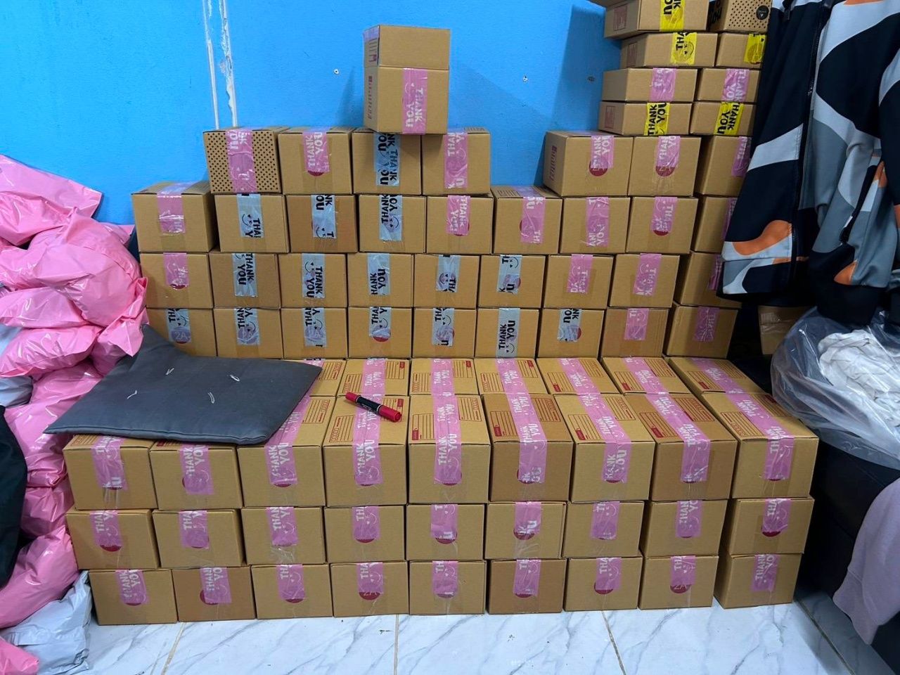 พร้อมตรวจอายัดของกลาง คอมพิวเตอร์ 4 เครื่อง, โทรศัพท์มือถือ 8 เครื่อง, สมุดบัญชีธนาคารของบุคคลอื่น (บัญชีม้า) 10 เล่ม, บัตรเอทีเอ็มของบุคคลอื่น (บัญชีม้า) 13 ใบ, ซิมการ์ดโทรศัพท์ที่ลงทะเบียนแล้ว (ไว้ใช้สมัครการส่งพัสดุเก็บเงินปลายทาง (COD)) 304 ซิม, กล่อง/ถุง บรรจุพัสดุที่ติดฉลากชื่อผู้รับพัสดุเตรียมส่ง 494 ชิ้น, กล่อง/ถุง บรรจุพัสดุแพ็กเรียบร้อยแต่ยังไม่ได้ติดฉลากชื่อผู้รับพัสดุ 517 ชิ้น, เสื้อผ้ามือสอง (ไว้บรรจุ) 320 ตัว, กล่องกระดาษ 2,900 ใบ และอุปกรณ์ที่ใช้ในการแพ็กสินค้าพร้อมเครื่องพิมพ์สติกเกอร์ชื่อและที่อยู่ของเหยื่อผู้รับของปลายทาง