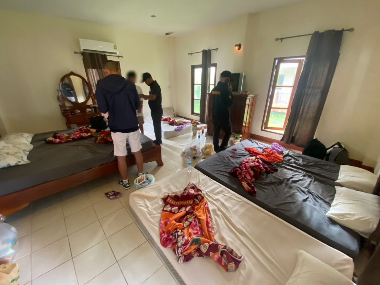 ชุดจับกุมให้ข้อมูลว่า ได้รับแจ้งจากเจ้าของรีสอร์ตดังกล่าว โดยคนดูแลชื่อสมใจ (ขอสงวนนามสกุล) ว่ามีกลุ่มคนจีนมาพักอาศัยอยู่จึงได้เดินทางเข้าไปตรวจสอบพบคนจีน 9 คนพักอยู่ในห้องพักใหญ่ มี 2 ห้องนอน ทุกคนเป็นชายทั้งหมด และไม่มีพาสปอร์ต หลังตรวจค้นภายในห้องที่รก และมีอาหาร ขนม กองอยู่จำนวนหนึ่ง และมีกลิ่นบุหรี่เหม็นเต็มทั้งสองห้อง และยังพบโทรศัพท์มือถือ จำนวน 48 เครื่อง