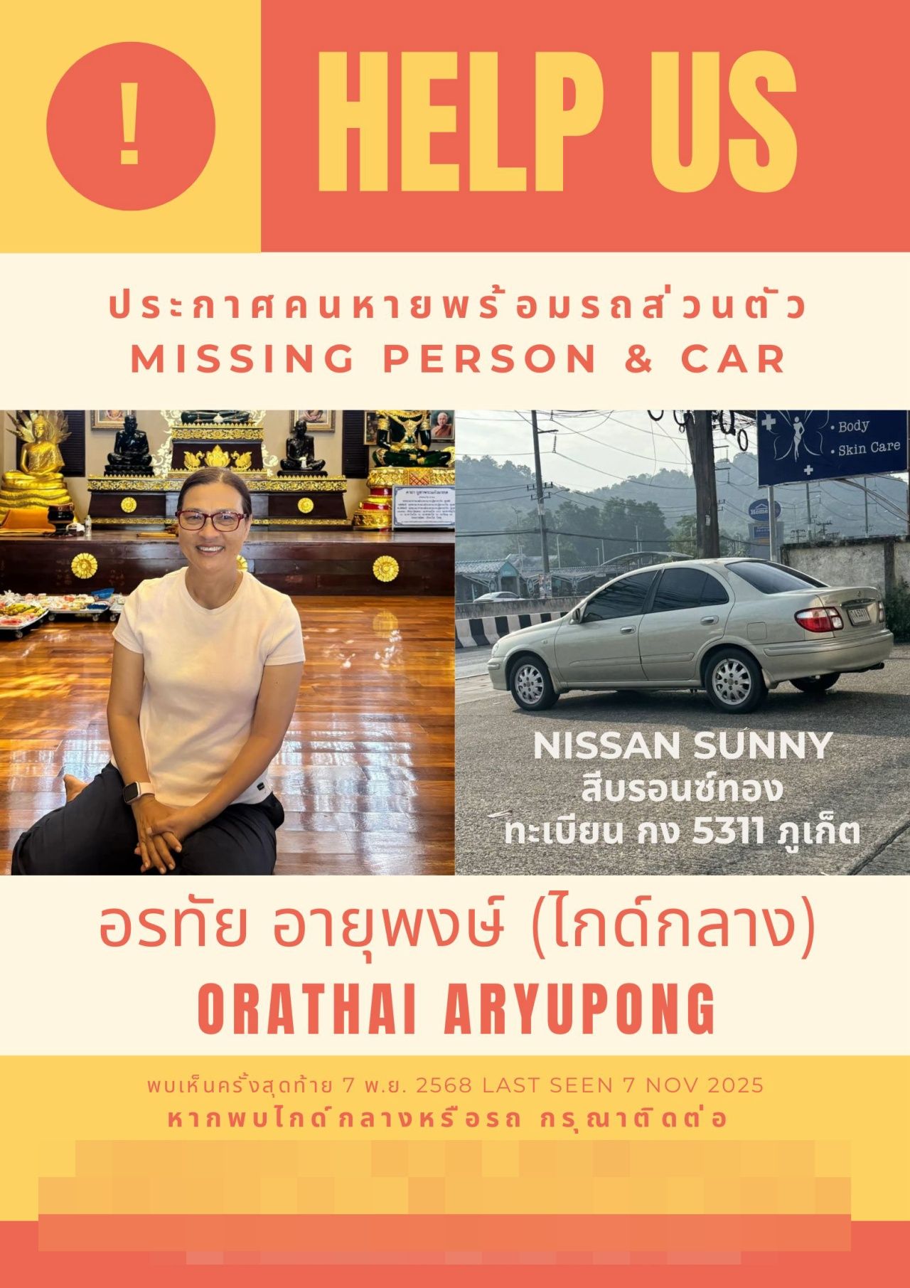 - ไกด์กลาง หายตัวออกจากบ้านตั้งแต่วันที่ 7 พ.ย. 68 ที่ผ่านมา พร้อมกับรถเก๋ง ยี่ห้อนิสสันซันนี่ สีบรอนซ์เทา ทะเบียนภูเก็ต