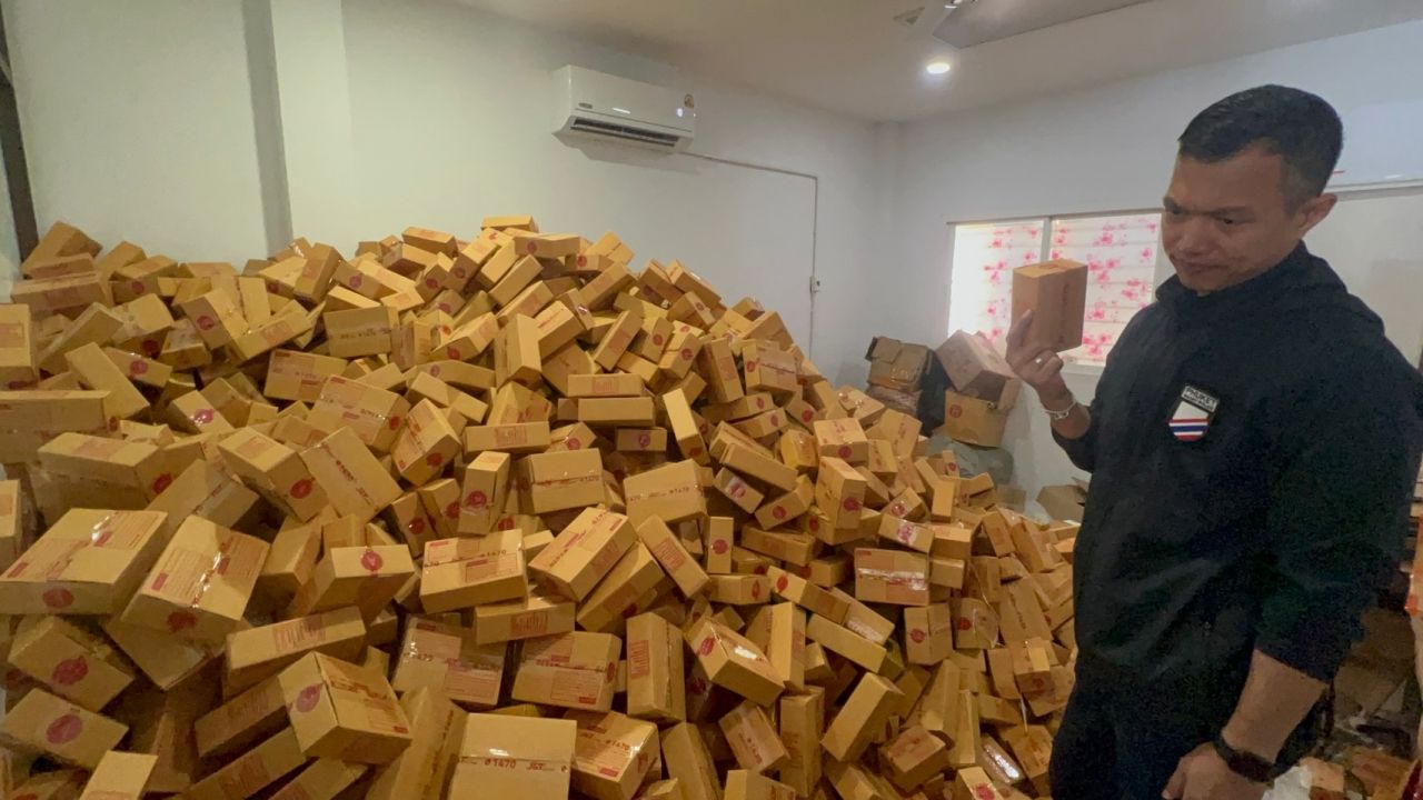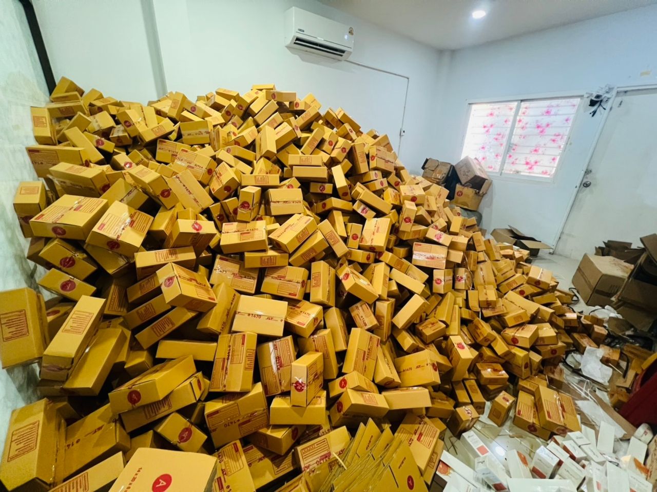 ทั้งนี้แบ่งของกลางเป็น 1.สินค้าผิดกฎหมายจำนวน 7,492 ชิ้น 2.อุปกรณ์พัสดุจำนวน 5,223 ชิ้น 3.พัสดุที่แพ็กแล้วจำนวน 3,890 ชิ้น 4.พัสดุพร้อมส่งจำนวน 1,099 ชิ้น 5.พัสดุตีกลับจำนวน 3,125 ชิ้น รวมทั้งสิ้นจำนวน 20,829 ชิ้น