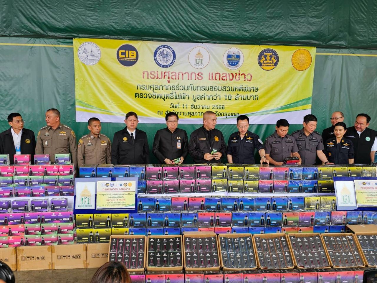 เมื่อเวลา 14.00 น. วันที่ 11 ธ.ค.68 ที่กรมศุลกากร นายสันติ ปิยะทัต รัฐมนตรีประจำสำนักนายก พล.ต.ท.รุทธพล เนาวรัตน์ รัฐมนตรีว่าการกระทรวงยุติธรรม พ.ต.ต.ยุทธนา แพรดำ อธิบดีกรมสอบสวนคดีพิเศษ นายพันธ์ทอง ลอยกุลนันท์ อธิบดีกรมศุลกากร นางสาวสุนทรียา ทวิชาประสิทธิ์ รองอธิบดี นายธนกฤต ลิ้นทอง ผู้อำนวยการสำนักงานศุลกากรท่าเรือกรุงเทพ พล.ต.ต.ทัศน์ภูมิ จารุปรัชน์ ผู้บังคับการปราบปรามการกระทำความผิดเกี่ยวกับอาชญากรรมทางเศรษฐกิจ กองบัญชาการตำรวจสอบสวนกลาง นายแพทย์ชยนันท์ สิทธิบุศย์ ผู้อำนวยการกองงานคณะกรรมการควบคุมผลิตภัณฑ์ยาสูบ นายกฤษดา สุขการีย์ รองผู้อำนวยการฝ่ายปฏิบัติการเรือและสินค้า การท่าเรือแห่งประเทศไทย แถลงข่าวจับกุม “บุหรี่ไฟฟ้า” ชนิดใช้แล้วทิ้ง จำนวน 46,260 ชิ้น มูลค่า 10,871,100 บาท ซึ่งเป็นการนำเข้ามาในราชอาณาจักร