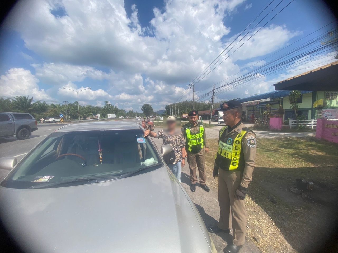 สืบเนื่องจากก่อนเกิดเหตุ ตำรวจทางหลวง ส.ทล.1 กก.7 บก.ทล. ออกตรวจพื้นที่รับผิดชอบ เมื่อมาถึงจุดเกิดเหตุพบรถเก๋งคันดังกล่าวจอดอยู่ริมถนน โดยติดแผ่นป้ายทะเบียนที่มีลักษณะผิดปกติ ไม่ตรงตามรูปแบบที่กรมการขนส่งทางบกกำหนด จึงขอตรวจสอบอย่างละเอียด จนพบว่า แผ่นป้ายทะเบียนและเครื่องหมายแสดงการเสียภาษีประจำปี เป็นเอกสารที่ทำปลอมขึ้น เจ้าหน้าที่จึงทำการจับกุมตัวผู้ขับขี่พร้อมของกลางไว้ดำเนินคดี