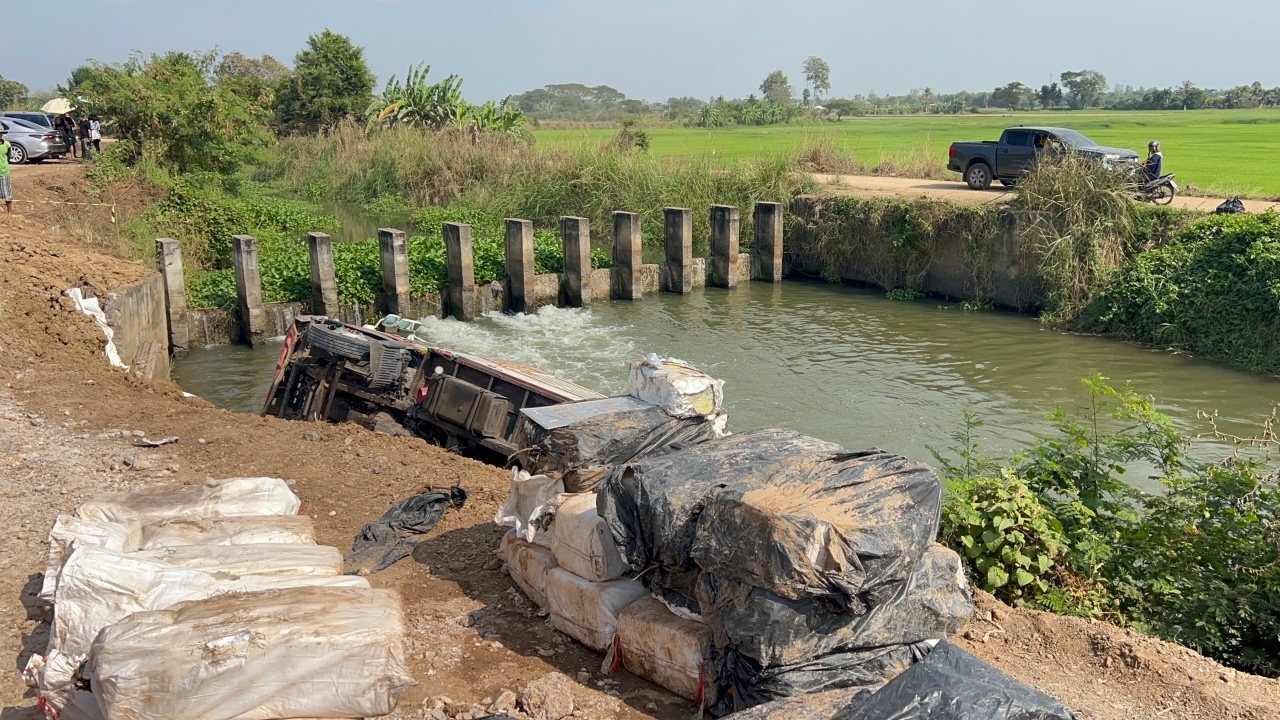 ในที่เกิดเหตุพบรถบรรทุก 10 ล้อ ยี่ห้อฮีโน่ สีขาว หมายเลขทะเบียน 70-4780 มหาสารคาม ตกถนนตะแคงอยู่ในน้ำ บริเวณหน้าฝาย โดยมีเจ้าหน้าที่ตำรวจได้ลงไปงมสิ่งของภายในรถขึ้นมาได้ คือ ถุงดำขนาดใหญ่ที่หุ้มกระสอบสีขาว เจ้าหน้าที่ได้ทำการเปิดดู พบว่าภายในมียาบ้า ชนิดเม็ดสีส้ม บรรจุอยู่ในกระสอบ และยังมีขิงสด อีกจำนวนหนึ่ง ทั้งนี้ได้ทำการตรวจเบื้องต้น ทราบว่า ยาบ้ามีจำนวน 20 กระสอบ กระสอบละ 2 แสนเม็ด รวมทั้งสิ้น 5 ล้านเม็ด