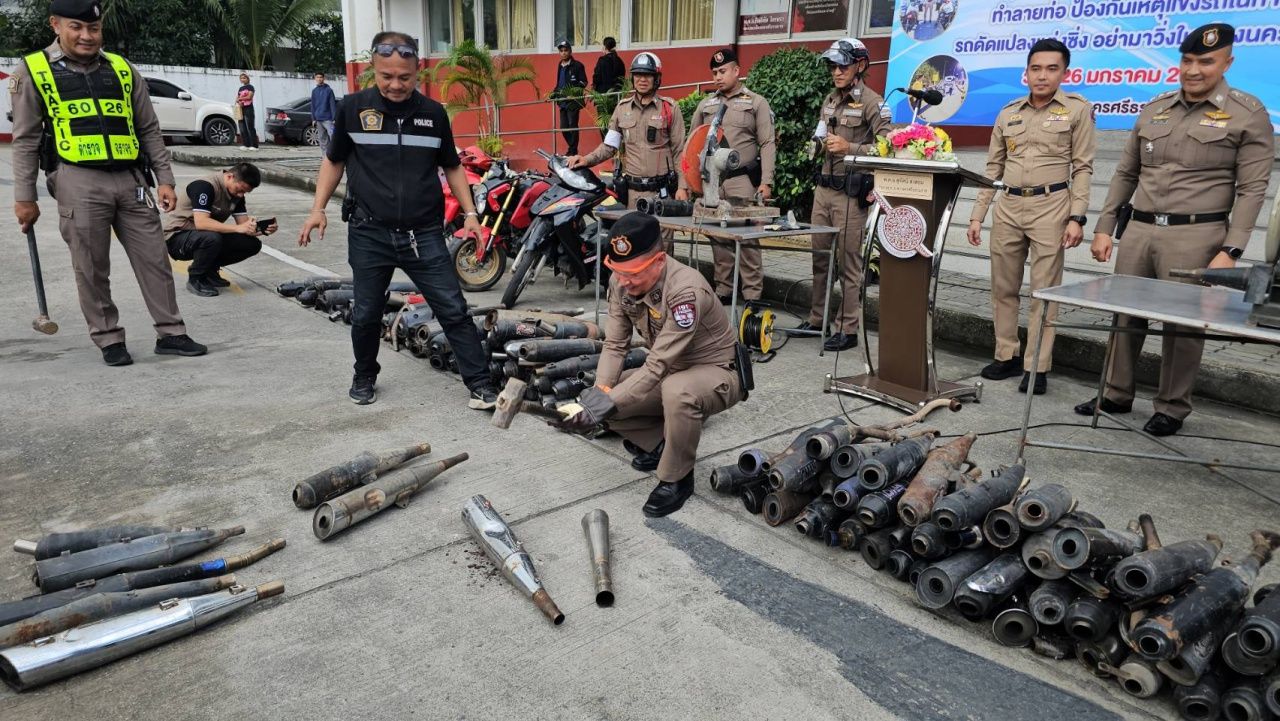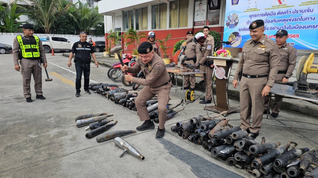 รอง ผบก.ภ.จว.นครศรีธรรมราช นำทีมแถลงผลการกวาดล้างจับกุมเด็กแว้น ตรวจยึด จยย.แต่งซิ่ง ท่อดัง สร้างความเดือดร้อนให้กับประชาชน ทุบทำลายท่อไอเสียโชว์ต่อหน้าผู้สื่อข่าว แสดงออกถึงความเอาจริงเอาจัง