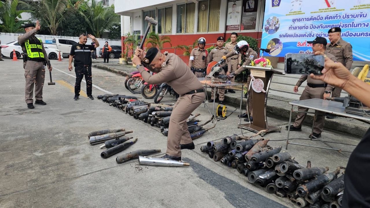 ซึ่งภายหลังประธานแถลงข่าวแล้วเสร็จ มีการทุบทำลายท่อไอเสียโชว์ต่อหน้าผู้สื่อข่าว เพื่อเป็นสัญลักษณ์ โดยมีนายตำรวจระดับสารวัตร รองผู้กำกับ ผู้กำกับ และรองผู้บังคับการจังหวัด โชว์ใช้ค้อนปอนด์ทุบท่อไอเสียต่อหน้าสื่อมวลชน แม้ว่าชุดที่สวมใส่ของตำรวจจะรัดแน่น แต่ก็ไม่เป็นอุปสรรคแต่อย่างใด.