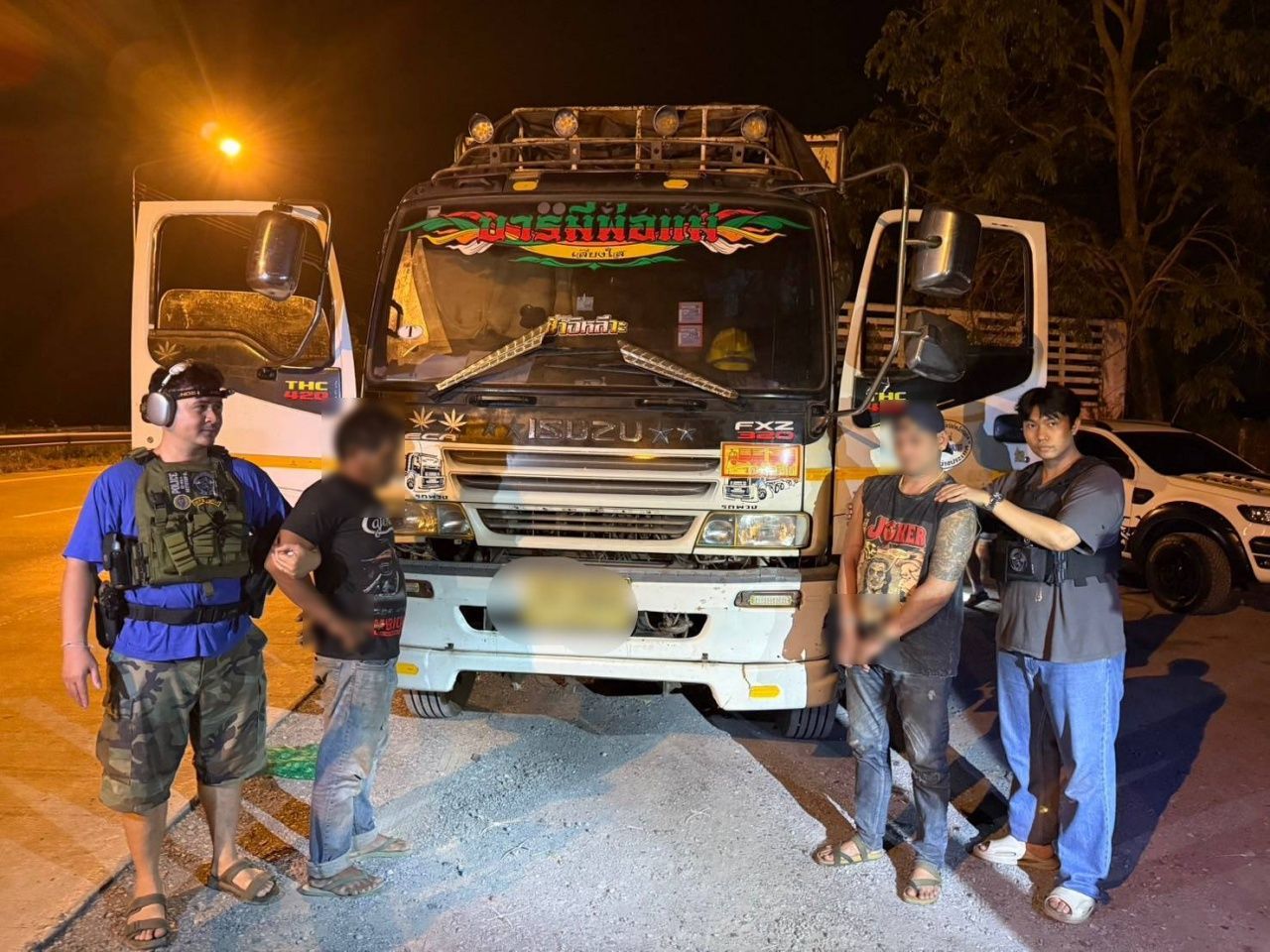 และพบรถยนต์บรรทุกพ่วงยี่ห้ออีซูซุ จอดอยู่ใกล้เคียงกัน คนขับรถทั้ง 2 คันดังกล่าวได้ยืนพูดคุยกันในลักษณะท่าทางมีพิรุธ ชุดจับกุมจึงได้กระจายกำลังอยู่บริเวณใกล้เคียง ต่อมาเวลาประมาณ 04.00 น. ขณะที่เจ้าหน้าที่เฝ้าสังเกตการณ์อยู่ ได้มีรถยนต์กระบะฟอร์ด รุ่นแรนเจอร์ สีน้ำเงิน เป็นรถเป้าหมายอีกคัน ขับมาจอดที่บริเวณริมถนนดังกล่าว ก่อนคนขับรถยนต์กระบะ ยี่ห้อฟอร์ด สีน้ำเงิน ลงจากรถ พร้อมกับเดินไปพูดคุยกับคนขับรถยนต์กระบะฟอร์ด สีขาว และคนขับรถยนต์พ่วงอีซูซุ
