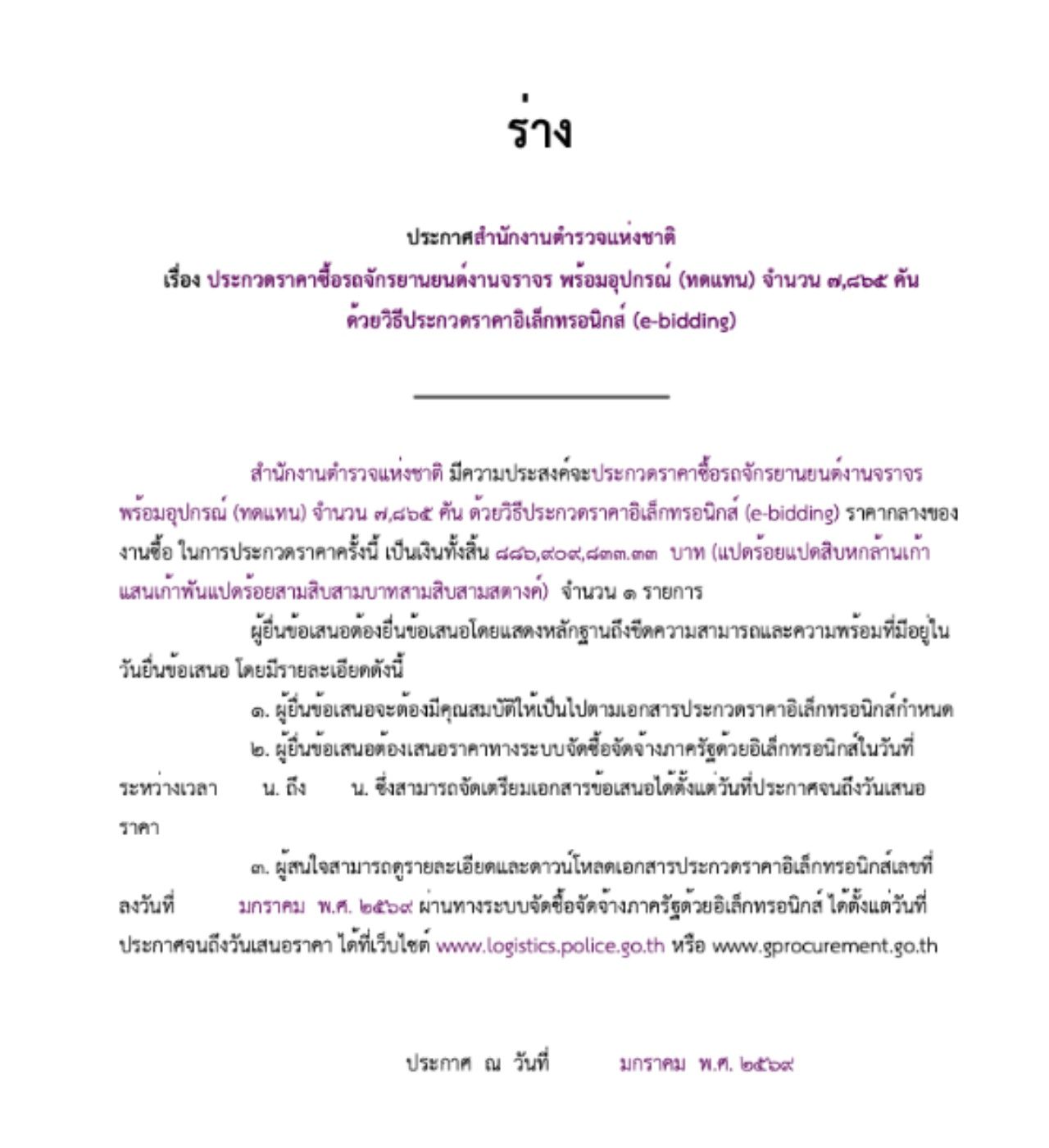 รายงานข่าวแจ้งว่า ก่อนหน้านี้เว็บไซต์สำนักงานส่งกำลังบำรุง สำนักงานตำรวจแห่งชาติ ได้เผยแพร่ประกาศเรื่อง ประกวดราคาซื้อรถจักรยานยนต์งานจราจร พร้อมอุปกรณ์ (ทดแทน) จำนวน 7,865 คัน ด้วยวิธีประกวดราคาอิเล็กทรอนิกส์ (e-bidding) ราคากลางของงานซื้อในการประกวดราคาครั้งนี้ เป็นเงินทั้งสิ้น 886,909,833.33 บาท (แปดร้อยแปดสิบหกล้านเก้าแสนเก้าพันแปดร้อยสามสิบสามบาทสามสิบสามสตางค์) จำนวน 1 รายการ