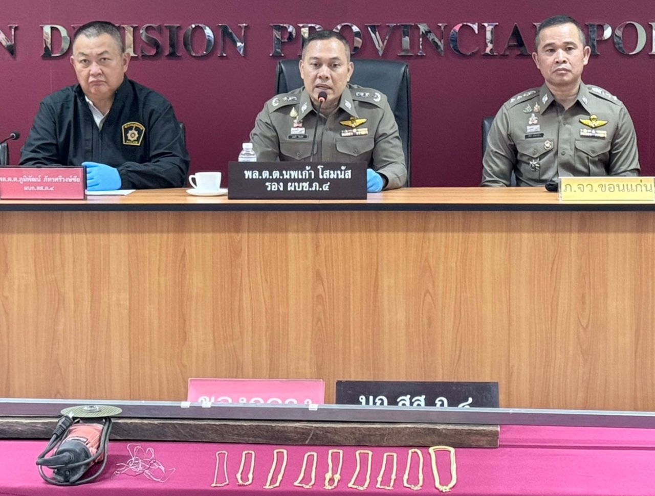 เมื่อเวลา 11.00 น.วันที่ 21 กุมภาพันธ์ 2569 ที่ศูนย์ปฏิบัติการกองบังคับการสืบสวนตำรวจภูธรภาค 4 พล.ต.ต.นพเก้า โสมนัส รอง ผบช.ภ.4 พล.ต.ต.ภูมิพัฒน์ ภัทรศรีวงษ์ชัย ผบก.สส.ภ.4 พ.ต.อ.ปรีชา เก่งสาริกิจ รอง ผบก.ภ.จว.ขอนแก่น พ.ต.อ.ภาคภูมิ เดชะเรืองศิลป์ ผกก.สภ.บ้านเป็ด ร่วมกันแถลงข่าวการจับกุม นายชลธิป (เก๋) สาระคำ อายุ 47 ปี ชาว จ.ขอนแก่น ในข้อหาชิงทรัพย์โดยทำอันตรายสิ่งกีดกั้นสำหรับคุ้มครองบุคคลหรือทรัพย์ โดยใช้ยานพาหนะ เพื่อกระทำผิดหรือเพื่อพาทรัพย์นั้นไปหรือเพื่อให้พ้นการจับกุม พร้อมของกลาง ไม้หน้าสาม ยาว 1 เมตร จำนวน 1 ท่อน เหล็กกล่องปากแฉก ยาว 1 เมตร จำนวน 1 ชิ้น สร้อยทองรูปพรรณ 9 เส้น รวมน้ำหนัก 21 บาท