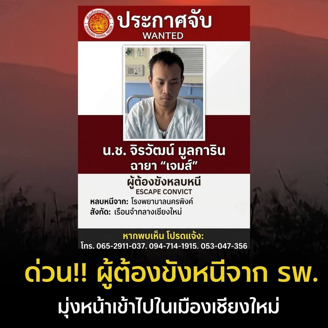 ตำรวจตั้งรางวัลนำจับ 5 หมื่นบาท ผู้แจ้งเบาะแสนักโทษชาย หนีออกจาก รพ.นครพิงค์ ที่เชียงใหม่ พบใช้ใบเลื่อยปลดกุญแจมือ เร่งล่า คาดได้ตัวเร็วๆ นี้