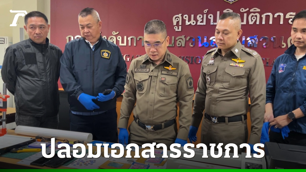 เมื่อเวลา 11.00 น. วันที่ 12 มีนาคม 2569 ที่ ศปก.กองบังคับการสืบสวนสอบสวนตำรวจภูธรภาค 4 พล.ต.ท.สันติ ชัยนิรามัย ผบช.ภ.4 และ พล.ต.ต.นพเก้า โสมนัส รอง ผบช.ภ.4 พล.ต.ต.ภูมิพัฒน์ ภัทรศรีวงษ์ชัย ผบก.สส.ภ.4 ร่วมกันแถลงข่าวการจับกุม นางสาวอรรฉราพรรณ อายุ 30 ปี และนายอนันต์ อายุ 39 ปี พร้อมของกลาง รถยนต์ยี่ห้อต่างๆ ทั้งกระบะและรถเก๋งที่ใช้ป้ายภาษีปลอม และทะเบียนปลอมจำนวน 10 คัน ตราปั๊มทองเหลืองหน่วยราชการ โทรศัพท์มือถือ 3 เครื่อง คอมพิวเตอร์ และเครื่องพิมพ์ 1 ชุด อุปกรณ์และเครื่องที่ใช้ในการผลิตเอกสารปลอมจำนวน 1 ชุด ป้ายภาษี บัตรประชาชนและใบขับขี่ จำนวน 6 ใบ
