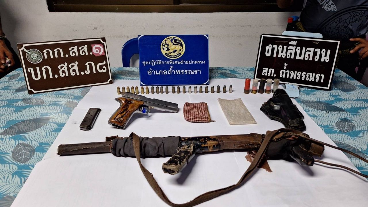 วันที่ 12 มีนาคม 2569 พันตำรวจเอกชัยภัทร ศรีเรือง ผู้กำกับการ สภ.ถ้ำพรรณรา นำกำลังตำรวจ สภ.ถ้ำพรรณรา สนธิกำลัง ชุดสืบสวนกองบัญชาการตำรวจภูธรภาค 8 ฝ่ายปกครองอำเภอถ้ำพรรณรา ได้สืบสวนติดตาม นายโกมินทร์ หรือ หมี ช้างกลาง อายุ 51 ปี มือปืนรายสำคัญ ชาวตำบลช้างกลาง อำเภอช้างกลาง นครศรีธรรมราช ซึ่งเป็นผู้ต้องหาคดีฆ่าผู้อื่นโดยไตร่ตรองไว้ก่อน ตามหมายจับของศาลจังหวัดเวียงสระ จ.สุราษฎร์ธานี