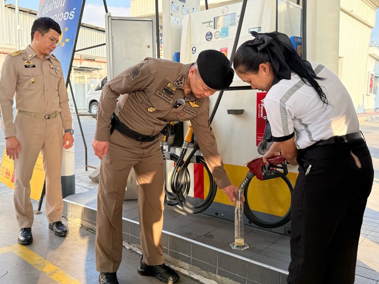วันนี้จึงร่วมกับฝ่ายปกครองอำเภอปากเกร็ด มาสุ่มตรวจปั๊มน้ำมันในพื้นที่ พบว่ามีใบจดทะเบียนถูกต้อง ครบถ้วน จากการตรวจสอบปริมาณน้ำมันพบว่าน้ำมันดีเซลหมด เนื่องจากประชาชนมาใช้บริการมากขึ้น ความต้องการมากขึ้น ส่วนน้ำมันเบนซินยังคงเพียงพอ ไม่มีผลกระทบ ส่วนการตรวจคุณภาพน้ำมัน พบว่ามีคุณภาพ ไม่มีสารปลอมปน