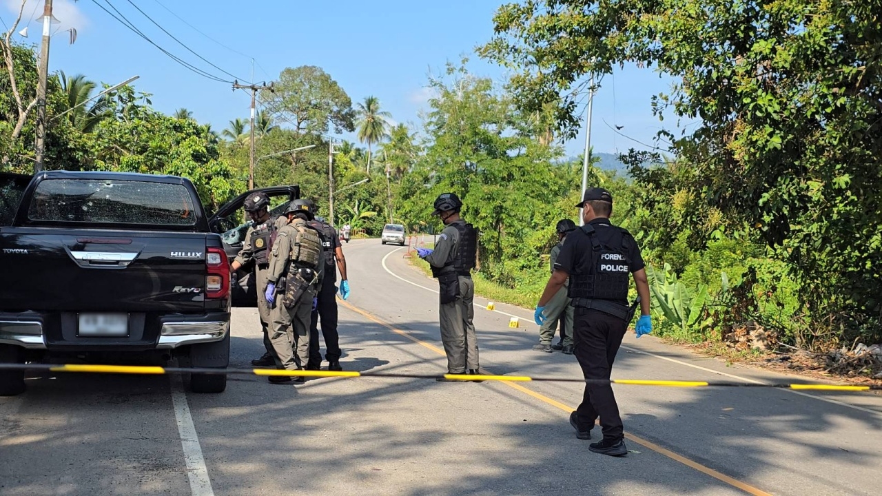 นราธิวาส - เจ้าหน้าที่สนธิกำลังเข้าตรวจสอบเหตุคนร้ายดักยิง “ปลัดอำเภอจะแนะ” เสียชีวิตพร้อมสาวที่นั่งมาด้วย คาดคนร้ายมี 2 กลุ่ม ทั้งซุ่มอยู่ในสวนผลไม้ อีกกลุ่มขี่รถจักรยานยนต์ติดตาม พฤติการณ์สุดโหดล้อมยิงจนรถพรุน พบปลอกกระสุน 4 ชนิดตกเกลื่อนพื้น รวม 68 ปลอก ชิงอาวุธปืนเอ็ม 16 ของทางราชการ หลบหนี