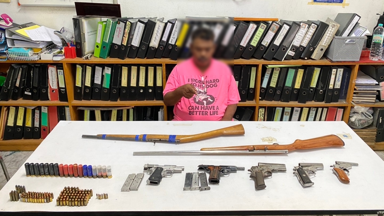 พร้อมของกลาง อาวุธปืนสั้นขนาด .45 นิ้ว 1 กระบอก อาวุธปืนสั้นขนาด 9 มม. 1 กระบอก อาวุธปืนลูกซองสั้นแบบไทยประดิษฐ์ ใช้กับกระสุนเบอร์ 12 จำนวน 2 กระบอก อาวุธปืนสั้นไทยประดิษฐ์ชนิดหักลำกล้องขนาด .38 นิ้ว 1 กระบอก อาวุธปืนยาวไทยประดิษฐ์ใช้กับกระสุนขนาด .22 นิ้ว จำนวน 2 กระบอก และกระสุนชนิดต่างๆ รวม 141 นัด