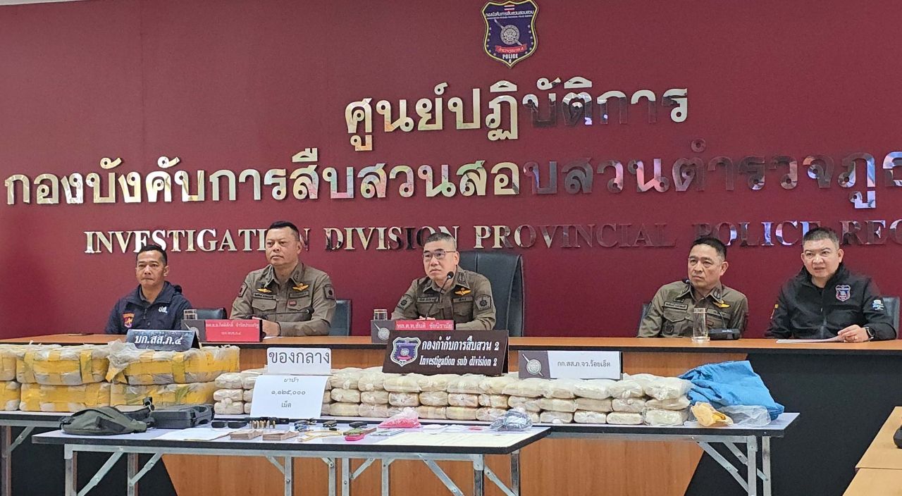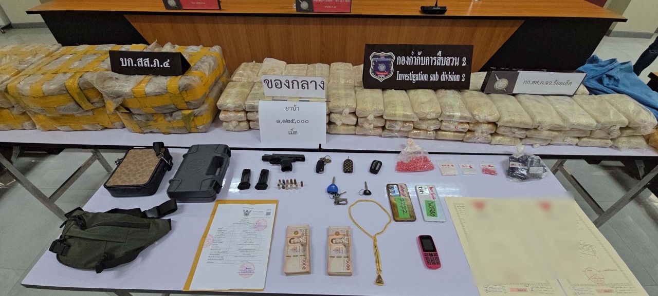 เมื่อเวลา 15.30 น.วันที่ 11 เมษายน 2569 ที่ ศปก.กองบังคับการสืบสวนสอบสวนตำรวจภูธรภาค 4 พล.ต.ท.สันติ ชัยนิรามัย ผบช.ภ.4 พร้อม พ.ต.อ.พงศ์ฤทธิ์ คงสิริสมบัติ รอง ผบก.สส.ภ.4 พ.ต.อ.นุติ ศักดิ์สุภาพ ผกก.สืบสวน 2 บก.สส.ภ.4 พ.ต.อ.วีระ หางนาค ผกก.สืบสวน ภ.จว.ร้อยเอ็ด ร่วมกันแถลงข่าวผลการจับกุม นายอภิภู หรือ นัท อายุ 34 ปี, นายชินกร หรือมาร์ค อายุ 28 ปี และนายยสินทร หรือเบ็นซ์ อายุ 29 ปี พร้อมด้วยของกลางยาบ้า จำนวน 1,125,591 เม็ด และยาไอซ์ น้ำหนัก 24.9 กรัม อาวุธปืนพกสั้น 1 กระบอก เครื่องกระสุนปืนขนาด 9 มม. 10 นัด