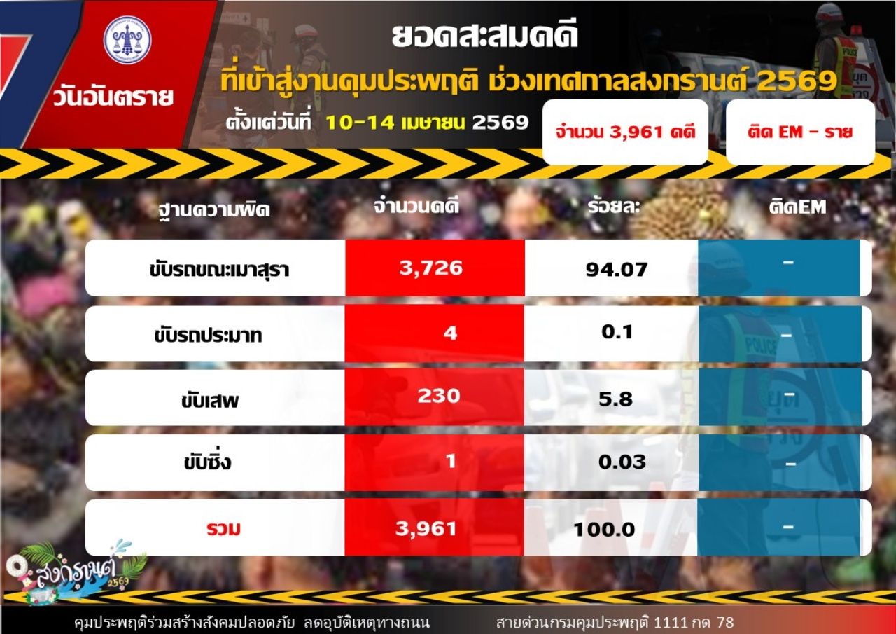 ขณะที่สถิติคดีสะสมช่วง 5 วัน ตั้งแต่ 10 – 14 เมษายน 2569 มีจำนวนรวม 3,961 คดี โดยเป็นคดีขับรถขณะเมาสุรา 3,726 คดี คิดเป็นร้อยละ 94.07 คดีขับเสพ 230 คดี คิดเป็นร้อยละ 5.8 คดีขับรถประมาท 4 คดี คิดเป็นร้อยละ 0.1 และคดีขับซิ่ง 1 คดี คิดเป็นร้อยละ 0.03 สำหรับจังหวัดที่มีสถิติคดีขับรถขณะเมาสุราสูงสุด 3 อันดับแรก ได้แก่ เชียงใหม่ 651 คดี สมุทรปราการ 317 คดี และนนทบุรี 266 คดี