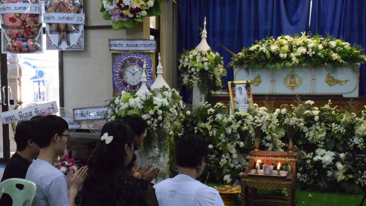 จุดบำเพ็ญกุศล อยู่ในศาลา 5 ภายในวัดดังกล่าว เบื้องต้น พบบรรดาญาติพี่น้อง กำลังจุดธูปเคารพศพ นายธีธัช หรือ ธัช ธนาอุทัย อายุ 27 ปี อยู่บ้านเลขที่ 27/78 หมู่ 5 หมู่บ้านสยามเนเชอรัลโฮม ต.พันท้ายนรสิงห์ อ.เมือง จ.สมุทรสาคร ปัจจุบันเป็นผู้บริหารของ บริษัท ทีพีเอ็มเซลล์ จำกัด ซื้อขายผลิตภัณฑ์เม็ดพลาสติก ท่ามกลางบรรยากาศที่แสนโศกเศร้า