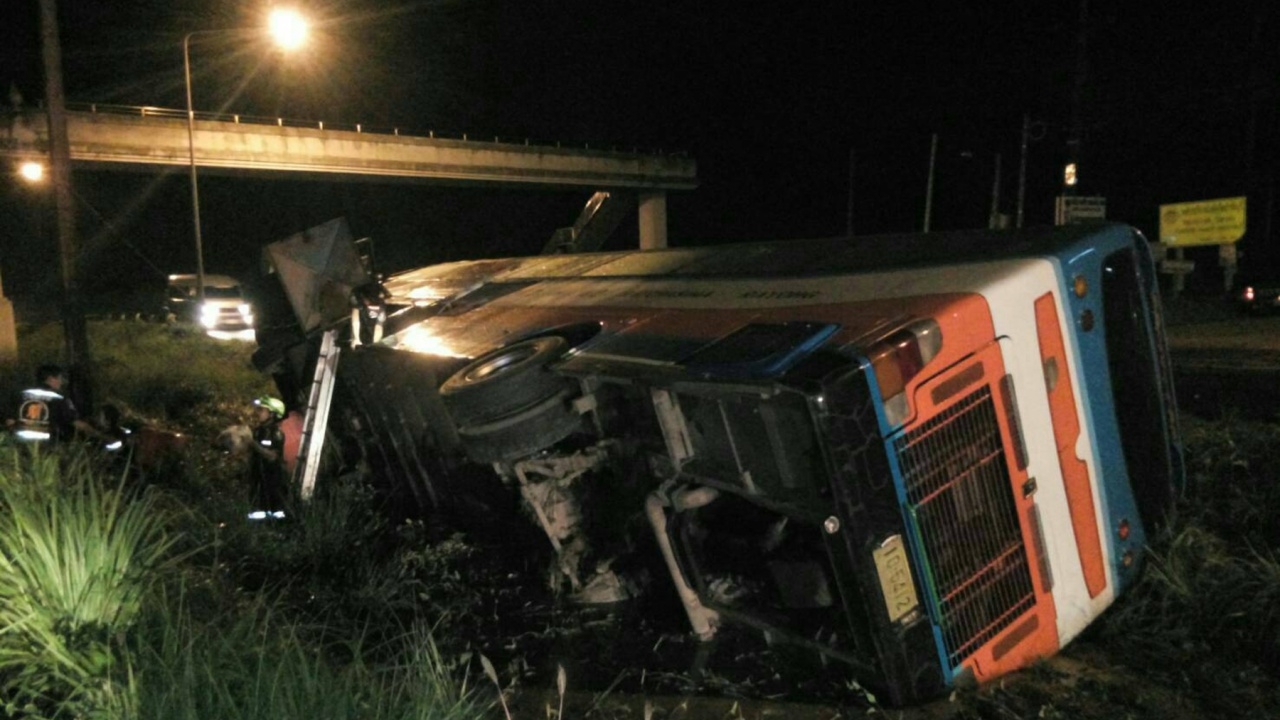 รถบัสรับผู้โดยสาร 40 คน จากระยอง เตรียมส่งปลายทางที่โคราช ถึงช่วงปราจีนฯ ยางหน้าระเบิดเสียหลังตกร่องถนนรถพลิกตะแคง โชคดีบาดเจ็บเล็กน้อย ไม่มีเสียชีวิต