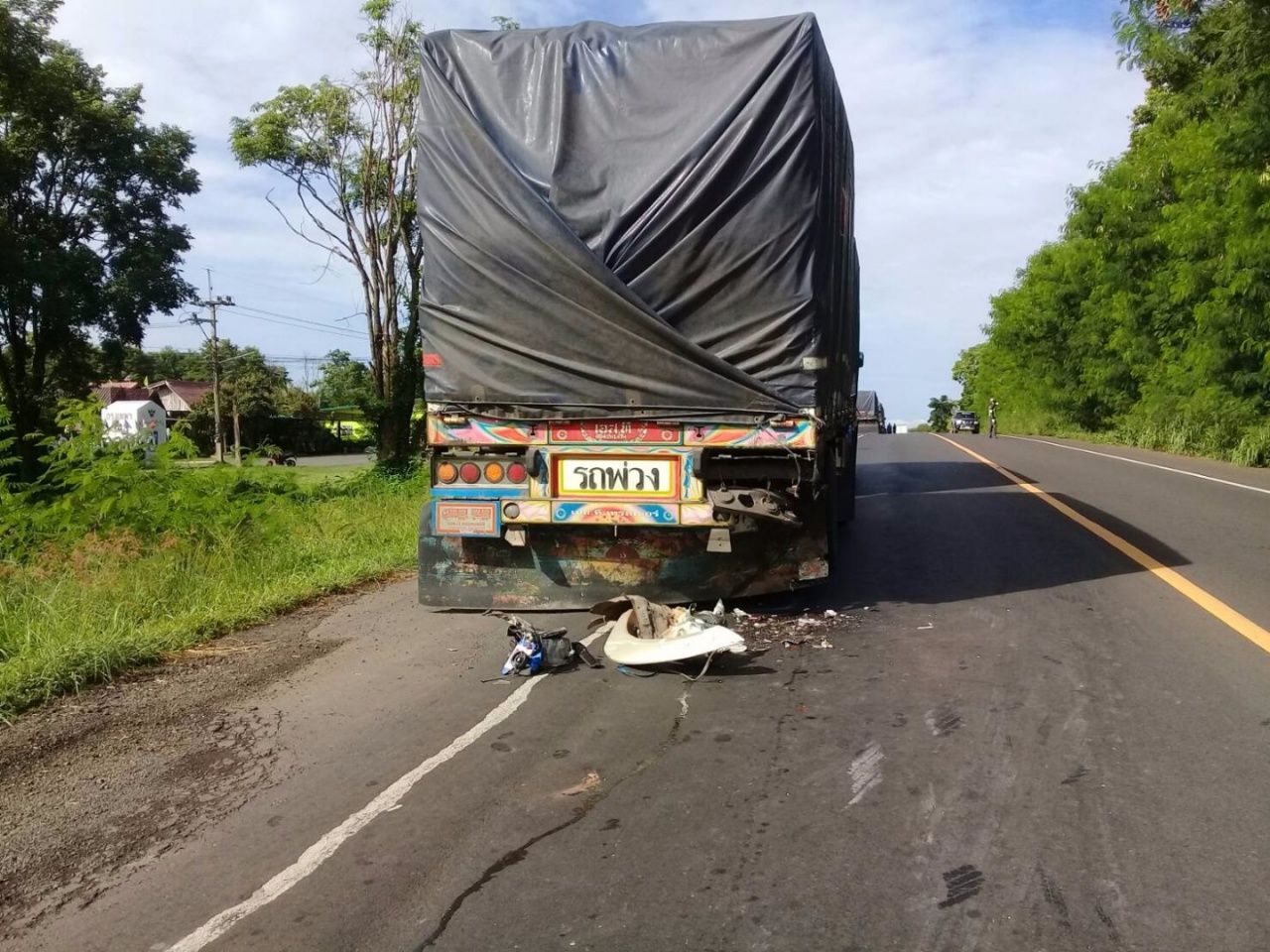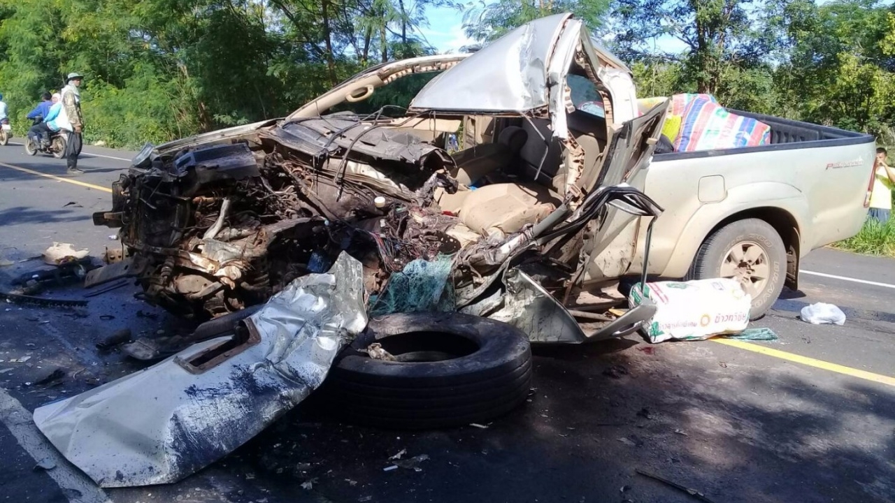 กระบะขนชาวกัมพูชา 4 ราย เตรียมกลับประเทศ พยายามขับแซงแต่เจอรถสวนทาง หักหลบชนท้ายรถพ่วงจนยางระเบิด ส่วนกระบะรถยุบไปครึ่งคัน ดับ 1 เจ็บ 3 คนขับหลบหนี
