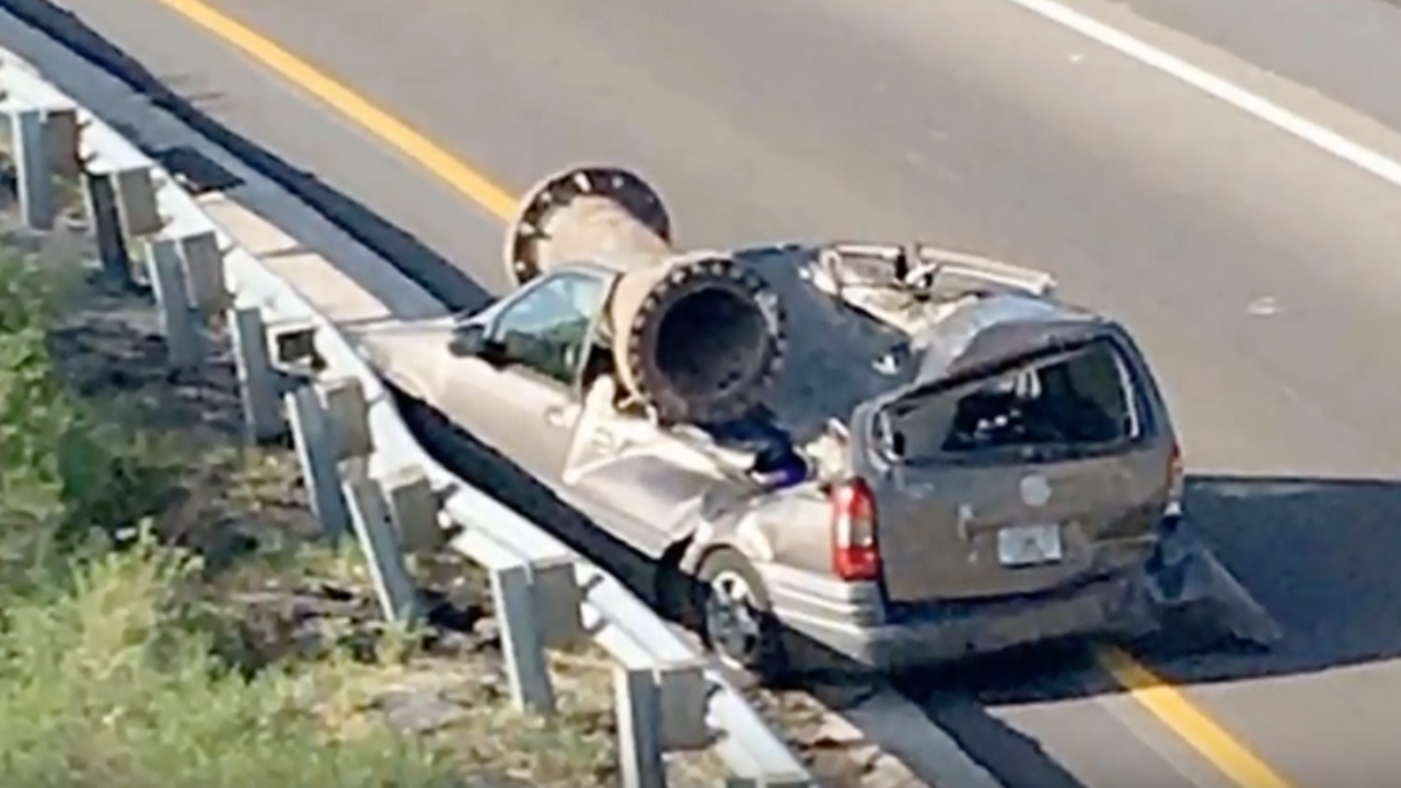 หนุ่มอเมริกันรอดตายเหลือเชื่อ เจอท่อเหล็กเก่าขนาดใหญ่ร่วงลงมาจากรถบรรทุก ที่วิ่งอยู่ทางหลวงข้างบน ตกใส่รถของเขาพอดี จนรถพังยับ แต่เขากลับได้รับบาดเจ็บแค่ฟกช้ำ