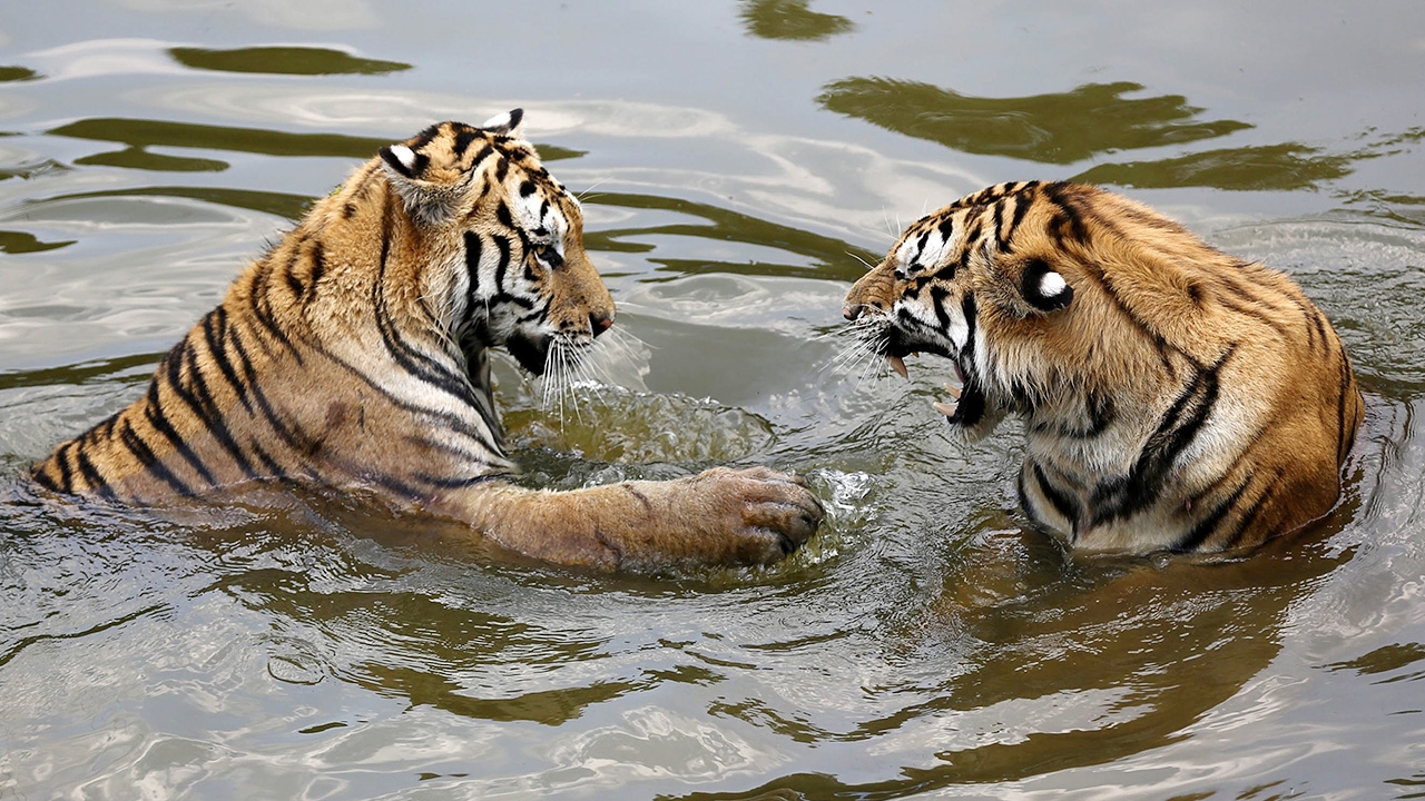 อุณหภูมิสูงทำเอาอากาศร้อนจนเสือโคร่งพันธุ์ไซบีเรียสองตัวนี้หาทางดับร้อน ด้วยการกระโดดลงไปแช่น้ำในบ่อน้ำที่อยู่ภายในกรงเสือ ของสวนสัตว์หวงซาน เมืองอานฮุย ประเทศจีน เสือสายพันธุ์ดังกล่าวไม่ได้มีแค่ชื่อเสือโคร่งไซบีเรียเท่านั้น ยังมีอีกหลายชื่อคือ เสือโคร่งอามูร์ เสือโคร่งจีนเหนือ หรือเสือโคร่งแมนจูเรีย ซึ่งเป็นสายพันธุ์ย่อยของเสือโคร่ง อยู่ในวงศ์ Felidae แต่ปัจจุบันเสือโคร่งชนิดนี้มีความเสี่ยงขั้นวิกฤติต่อการสูญพันธุ์.