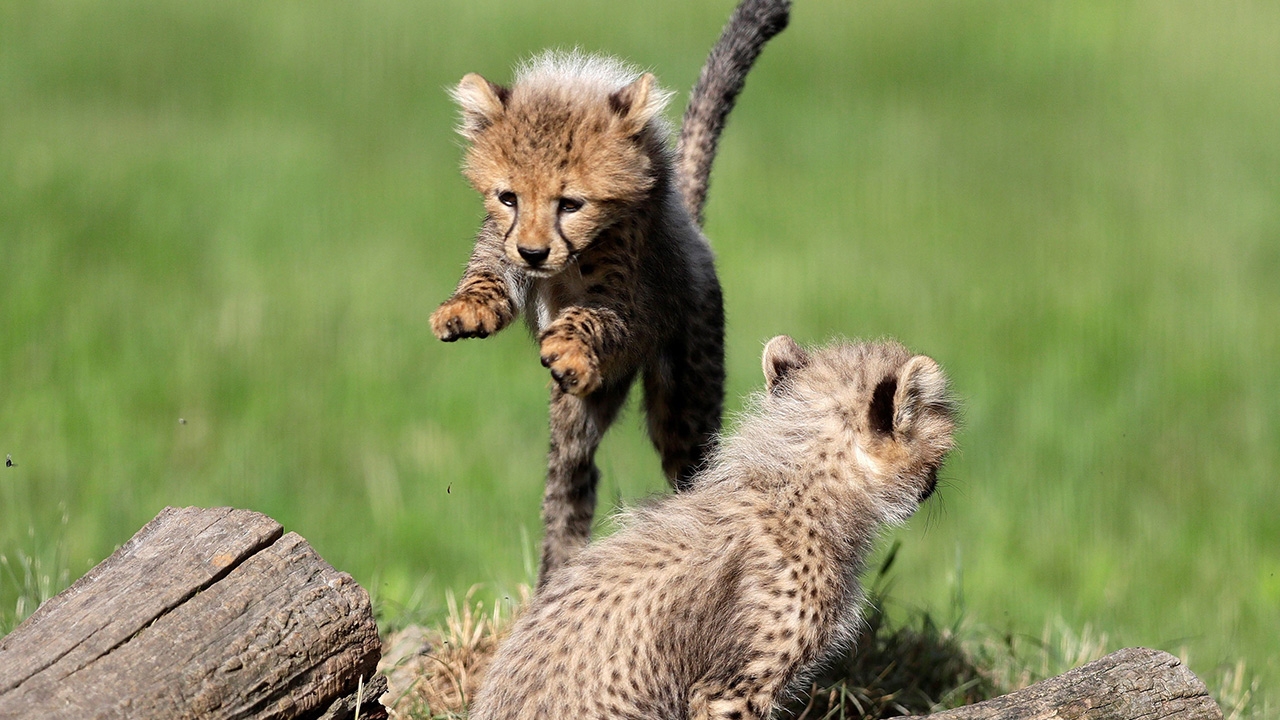 ลูกเสือชีตาห์วัย 2 เดือนกว่าๆ แสดงความแข็งแรงของร่างกายด้วยการกระโดดข้ามหลังของพี่น้องร่วมท้องเดียวกัน ขณะกำลังเล่นซุกซนอยู่ในกรงเสือภายในสวนสัตว์กรุงปราก สาธารณรัฐเช็ก ซึ่งลูกเสือทั้งสองเกิดมาจากท้องแม่เสือชื่อซาวันนาห์ ที่ตกลูกออกมาพร้อมกันครอกเดียวถึง 5 ตัว ทั้งนี้ เสือชีตาห์เป็นเสือขนาดเล็ก แต่มีรูปร่างสง่างาม และมีความสามารถในการวิ่งเร็วที่สุดในโลก.
