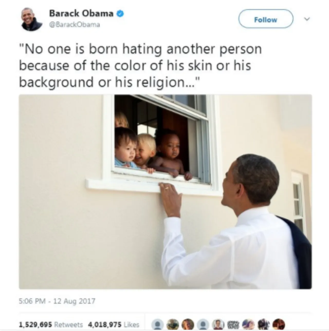 เมื่อ 17 ส.ค.60 สื่อต่างประเทศรายงาน ทวิตเตอร์ของอดีตประธานาธิบดีบารัค โอบามา แห่งสหรัฐฯ @BarackObama ที่ทวีตข้อความแสดงความรู้สึกต่อเหตุการณ์รุนแรงที่มาจากความขัดแย้งด้านสีผิว ในเมืองชาร์ลอตต์วิลล์ส ได้ทำลายสถิติ มียอดไลค์ (Like) สูงสุดแล้ว ถึง 4 ล้านครั้ง และถูกแชร์ต่อแล้วถึง 1.52 ล้านครั้ง ในสังคมออนไลน์แห่งนี้